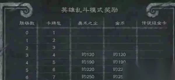 0胜: 1卡牌包 1胜: 2卡牌包 2胜: 3卡牌包 3胜: 4卡牌包,120奥术之尘,120金币 4胜: 5卡牌包,190奥术之尘,190金币 5胜: 6卡牌包,220奥术之尘,220金币 6胜: 7卡牌包,250奥术之尘,250金币 7胜: 8卡牌包,280奥术之尘,280金币 8胜: 9卡牌包,310奥术之尘,310金币 9胜: 16卡牌包,400奥术之尘,400金币 10胜: 16卡牌包,400奥术之尘,400金币,1张金卡 11胜: 16卡牌包,480奥术之尘,480金币,2张金卡 12胜: 50卡牌包,1100奥术之尘,1100金币,3张金卡