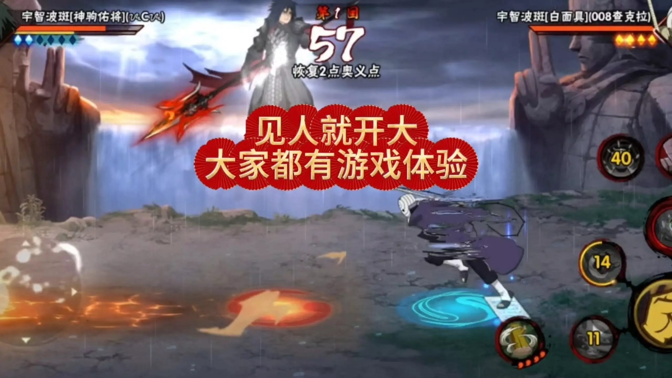 这是火影忍者手游的对战内容,2000万战力的技术选手使用宇智波斑[白面具],跨2300万战力战胜4300万榜一的猿飞日斩[秽土转生],帖子指出氪佬对战翻车多是缺查克拉,查克拉可解决没豆不能替身、摸不到敌人的问题。