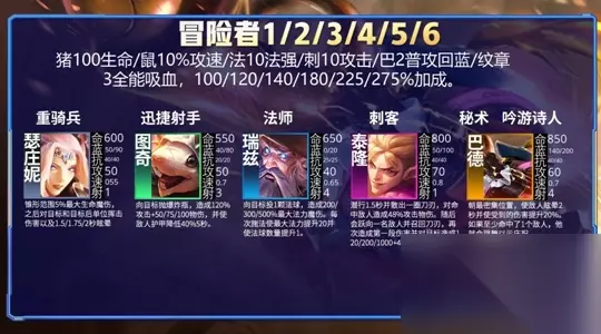 3、冒险者 猪100生命/老鼠10%攻速/法10法强/刺10攻击/巴2普攻回蓝/纹章3全能吸血,100/120/140/180/225/275%加成。