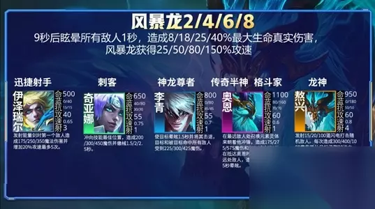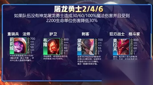 4、屠龙勇士 如果队伍没有神龙,屠龙勇士造成30/60/100%魔法伤害并且受到2200生命单位伤害降低30%。