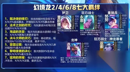 1、s7赛季的羁绊主要有着28种不同的羁绊,每个羁绊都有着不同的属性。 2、这个赛季的羁绊英雄更多,搭配起来也会更加的多样化,玩法更加有趣。 云顶之弈s7羁绊效果一览 1、幻境龙 随机在下列7个羁绊中随机获取一种。 裁决使的锋刃: 攻击技能对生命低于x%造成暴击,并增加x%的暴击伤害。 法术之剑的符咒: 与玩家战斗时每次攻击提升x法强。 海盗的贪婪: 每次与玩家战斗获得0-4金币,x更高概率获得更多金币。 决斗大师的灵巧: 固有:移动速度更快,每次攻击6/12/20/30%攻速,最多10次。 雷霆过载: 每次攻击被攻击x几率对临格x%最大生命伤害。 黎明使者的决心: 首次跌到x%生命会恢复x%最大生命。 猛将的荣耀: 每次与玩家胜利获得x生命,x法强,最多5次。