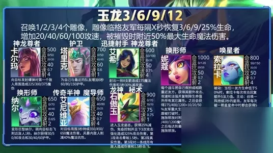 7、玉龙 召唤1/2/3/4个雕像,雕像临格友军每隔x秒恢复3/6/9/25%生命,增加20/40/60/100攻速。 被摧毁时附近50%最大生命魔法伤害。