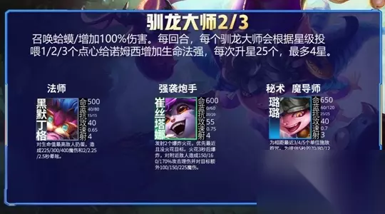 5、训龙大师 召唤蛤蟆/增加100%伤害。每回合,每个驯龙大师会根据星级投喂1/2/3个电信给诺姆西增加生命法强,每次升星25个,最多4星。
