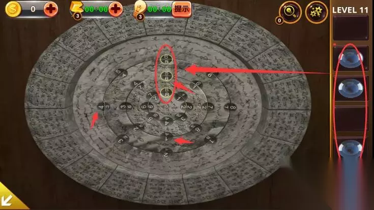 10、根据提示旋转右边的石牌,大圈让数字4朝左,中间让数字1朝下,小圈让数字8朝上,最后把三颗球放在黄色圈圈里面即可过关。