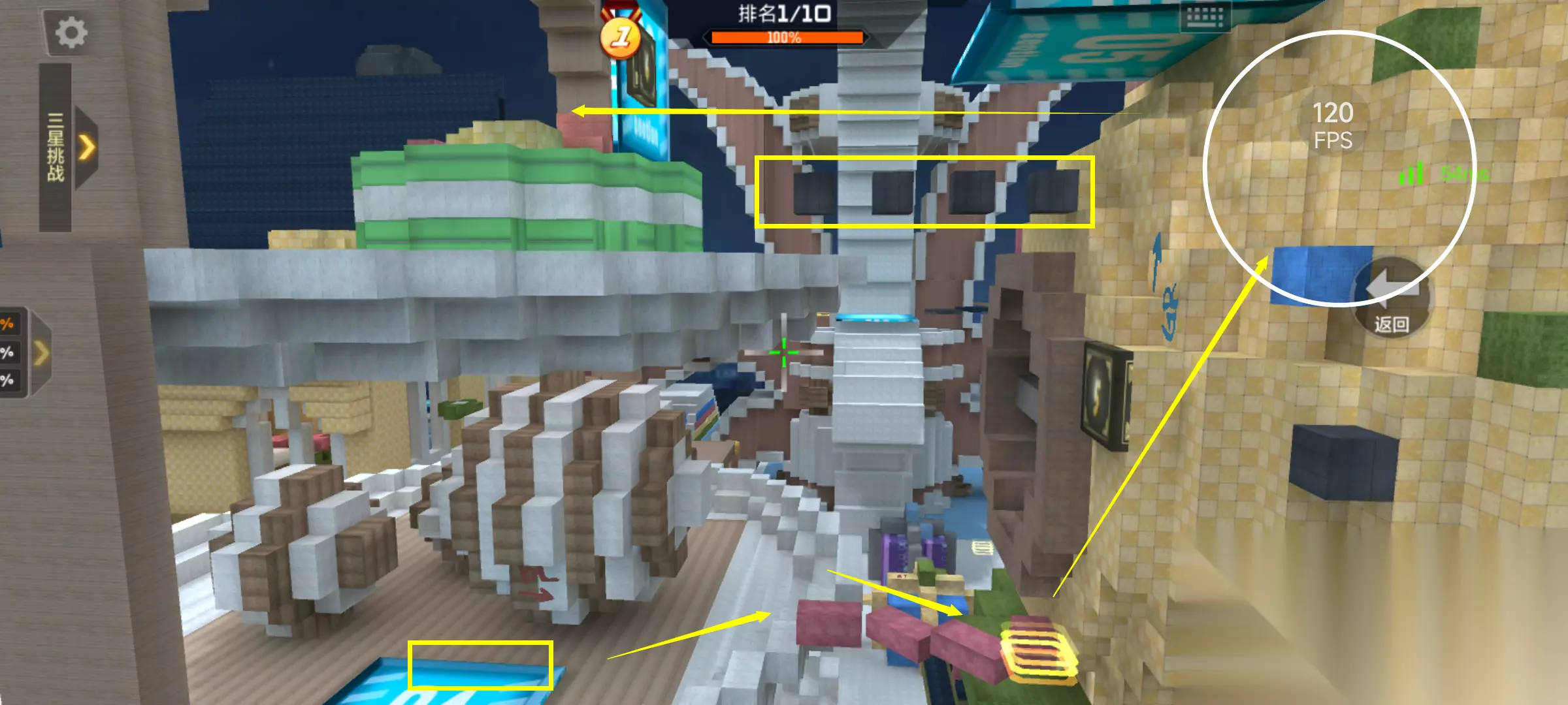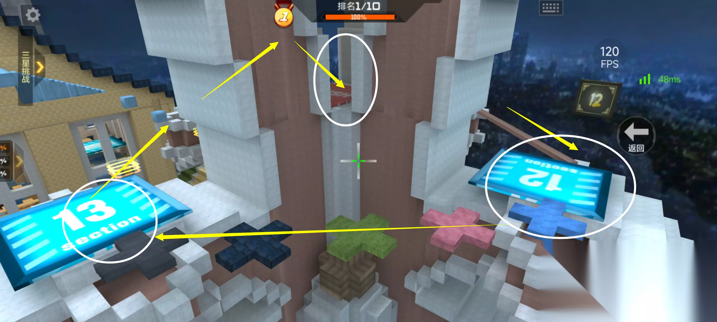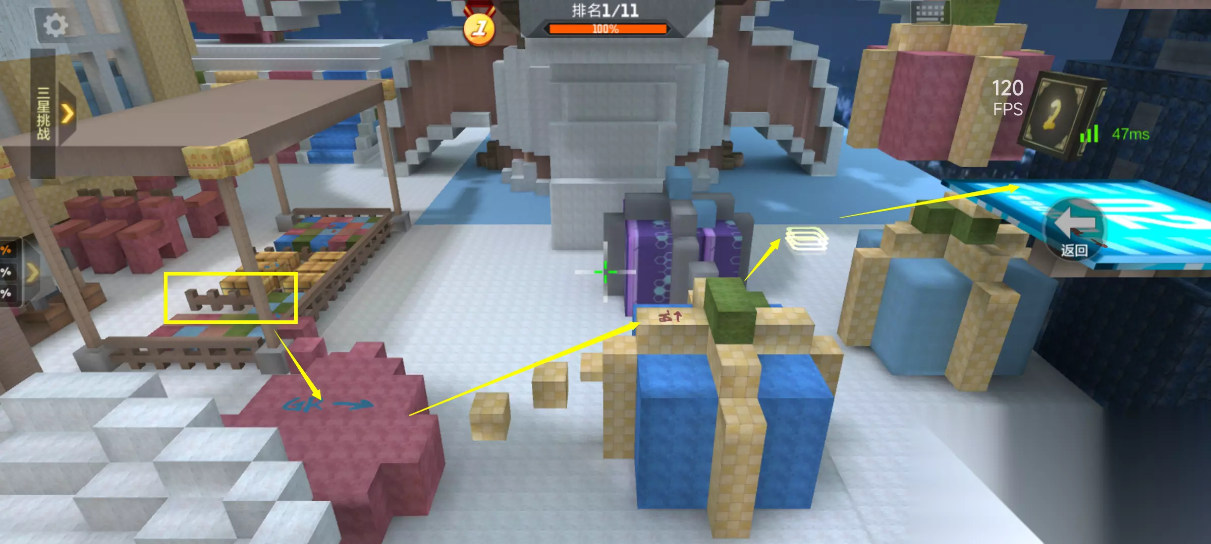 游戏一开局我们就会复活在地图中央的棚子里,当初小编第一次玩这张地图的时候,第二关入口都找了大半天才找着,其实只需要找到红色方块方向的标识后再跳跃几个方块通过弹簧即可到达第二关。