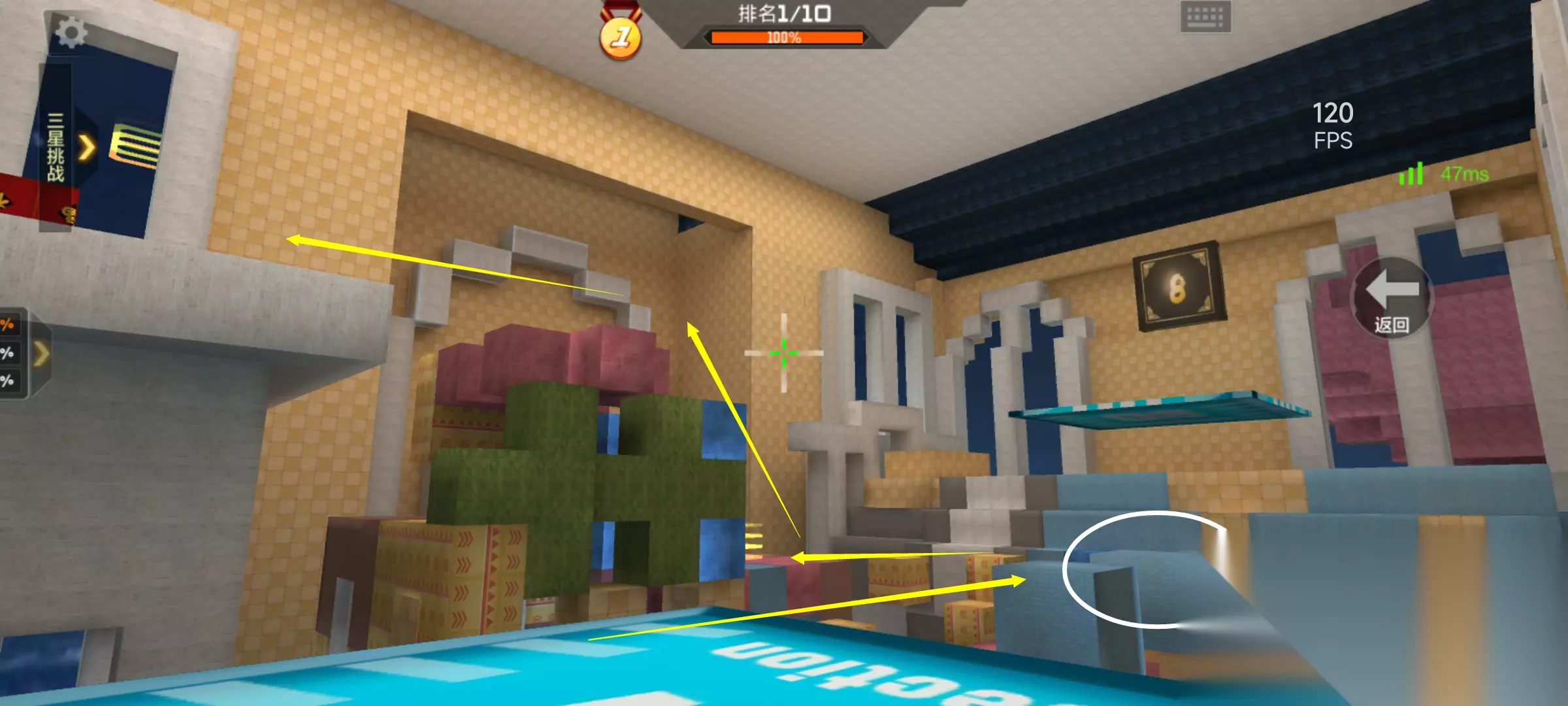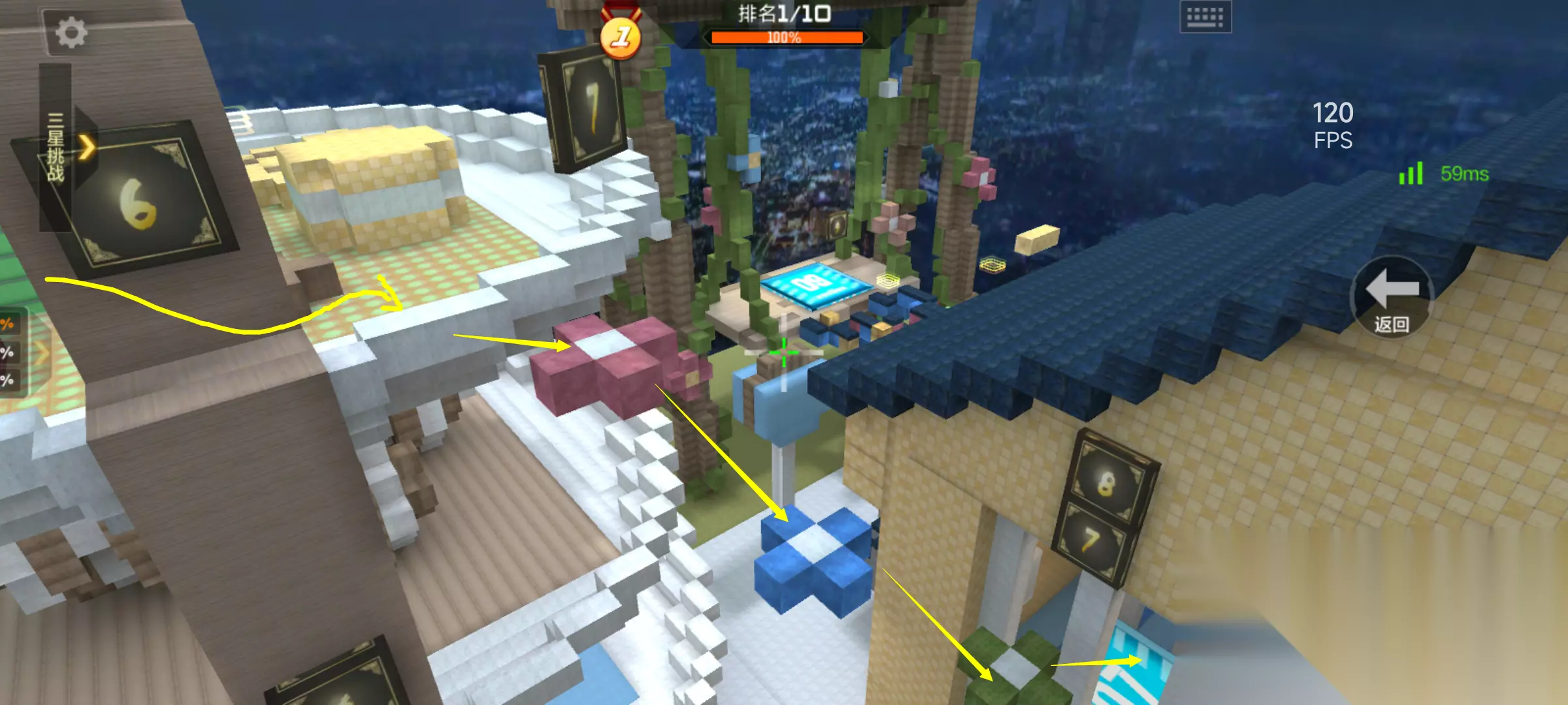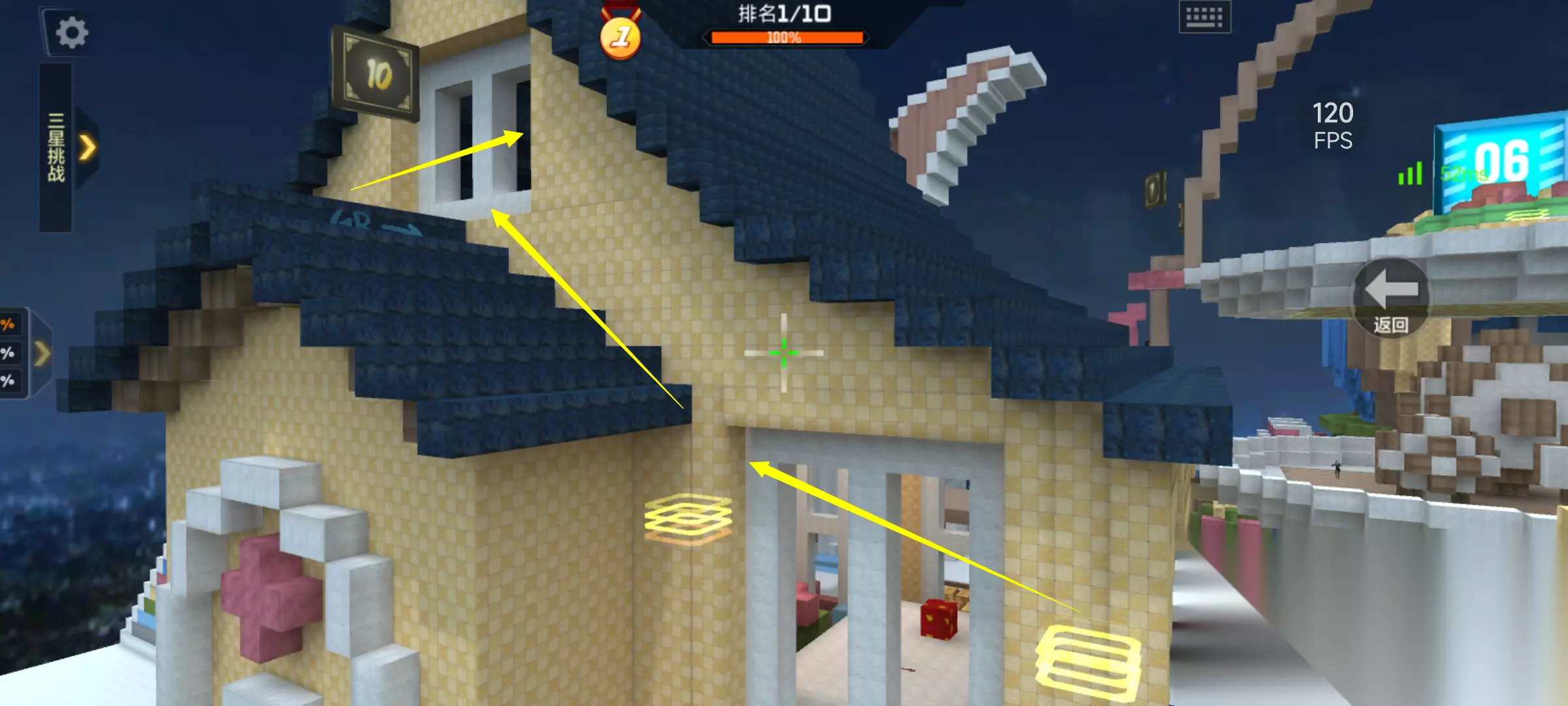 游戏一开局我们就会复活在地图中央的棚子里,当初小编第一次玩这张地图的时候,第二关入口都找了大半天才找着,其实只需要找到红色方块方向的标识后再跳跃几个方块通过弹簧即可到达第二关。