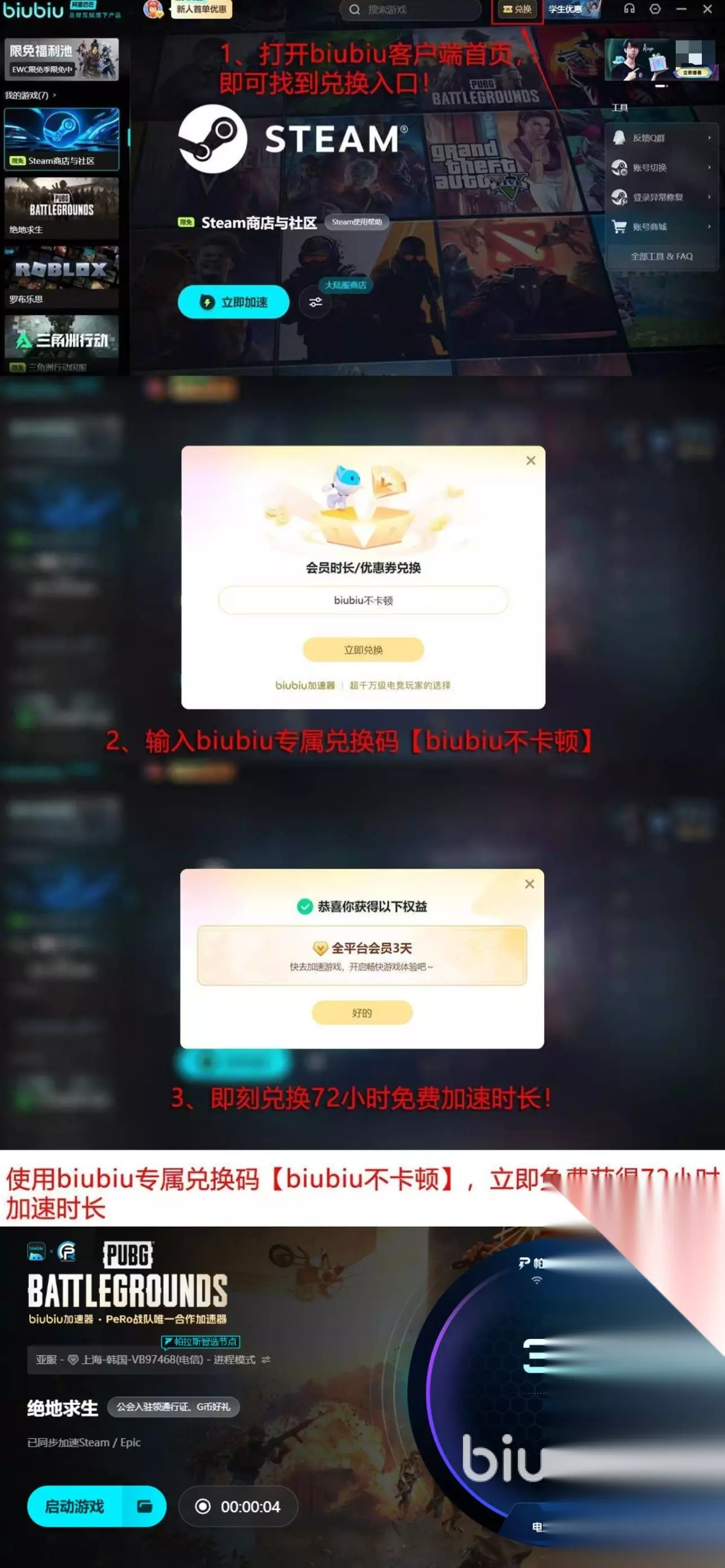 试用优惠都准备好了,那是要利用上的。新用户注意,注册账号后登录有个礼包,拿了就能免费用加速时间长达24小时,接着参与下兑换活动,【biubiu不卡顿】用了就再领72小时加速福利,综合下来领用完的新用户享受的免费服务时长达到了96小时。