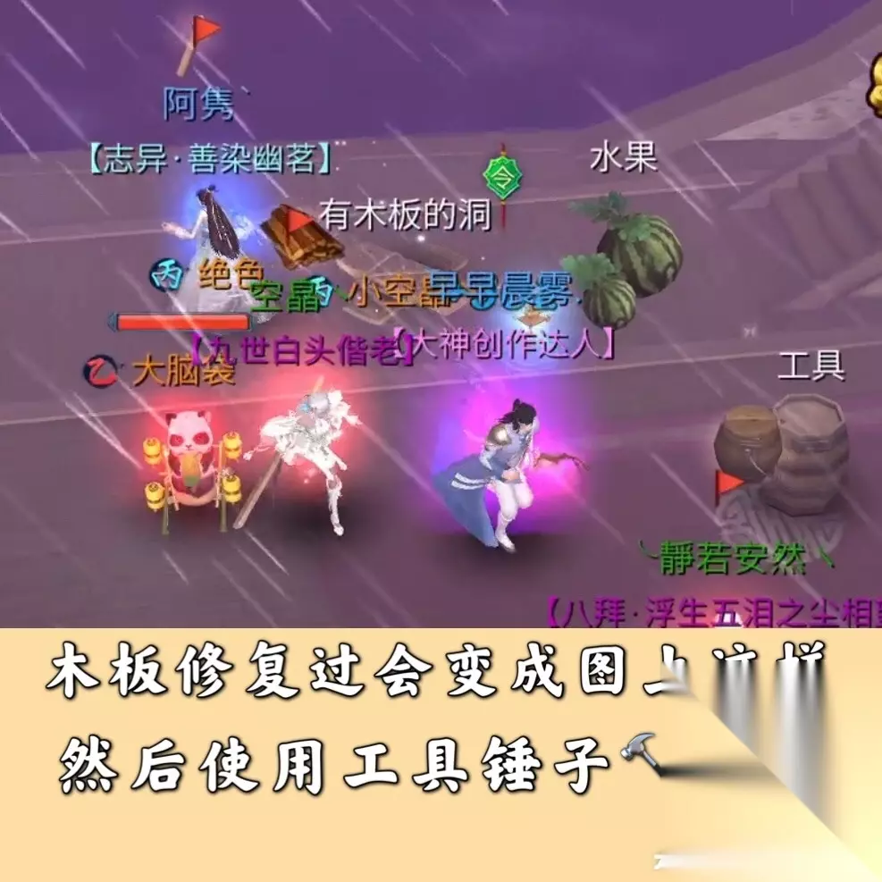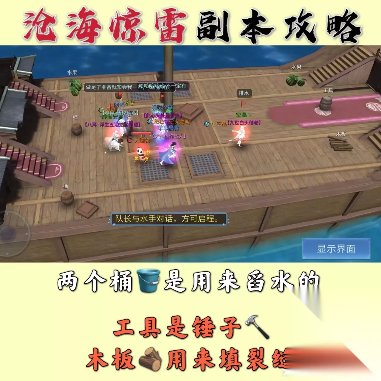 虽然是简单,但还是有难点 主要在于,一开始修复船只的时候 建议 固定两个人拿水桶,两个人拿木板,一个人锤子 不足时,在应变,不然先固定,防止手忙脚乱 修复的顺序 破洞,先木板,后工具 积水,桶舀水