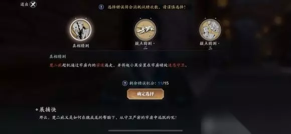 【任务攻略】 死因猜想: 尸检报告 展捕快证言·枯藤草 王卓言证言·病情 动机猜测1: 信件残页 悬赏通告 江歌证言·询问 李大证言·打探 遗落的信件 猜测二:猜测二: 石料 破损的地面 李大证言·意外 王卓言证言,修理牢房 李小证言·意外 疑点猜测三: 李大证言·争吵 李小证言·异常 江歌证言·争吵 王卓言证言·不适 真相猜测: 密道入口 李大证言·争吵 赵小果尸体 王卓杰证言·巡逻 凶手:魏成龙 最后选择: 213 动机一、真相猜测、疑点三
