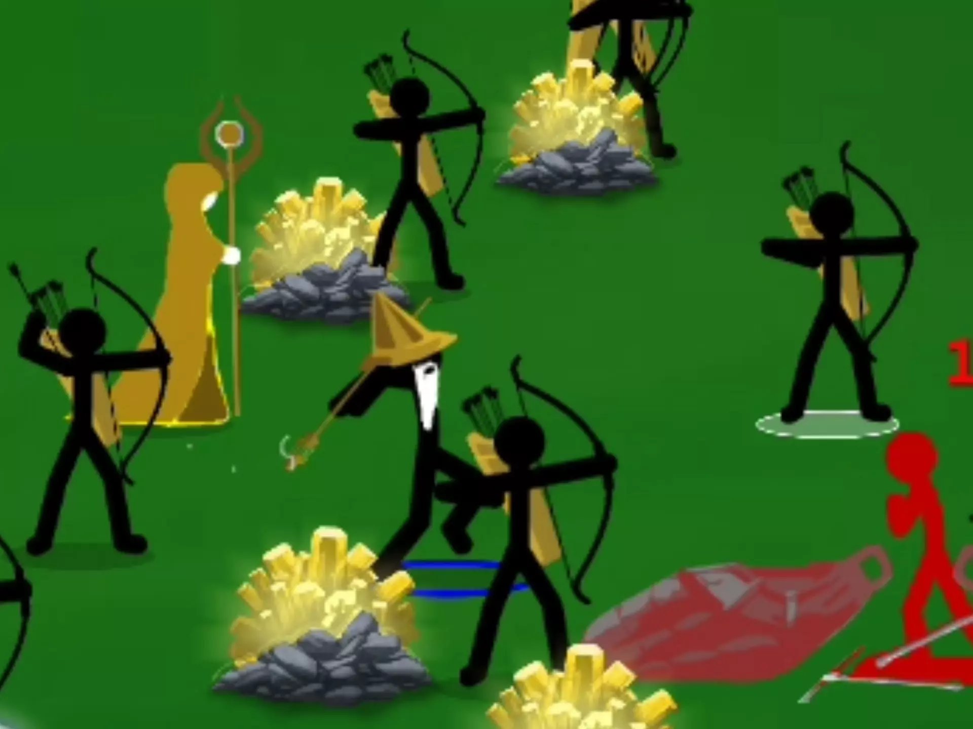这是策略游戏《火柴人战争困难版》的游戏内容展示,呈现了对战法师阵营Magikill的过程,玩家操控火柴人战士与敌方的法师、雕像等战斗,需完成摧毁Magikill雕像的目标。