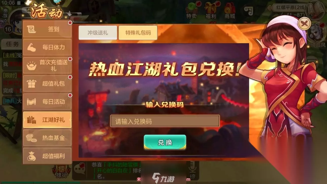 热血江湖礼包激活码 vip666 vip888 vip999 yxjh66666 yxjh99999 rx666 rx888 JHQY8888 4717IW9LI53QXGJQXJXL 热血江湖礼包激活码怎么用 1、进入游戏后,点击屏幕右上角的“福利”图标。