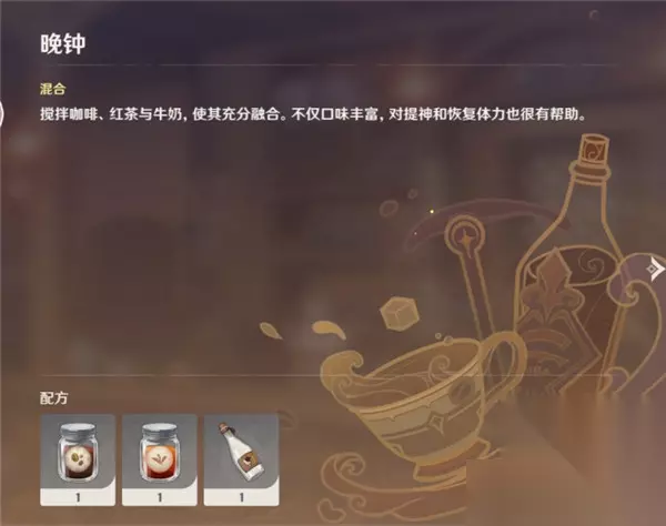 晨曦清露、风神之赐和隐藏饮品待解锁 混合 晚钟配方:咖啡 红茶 牛奶