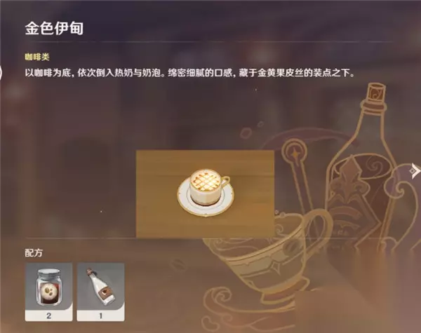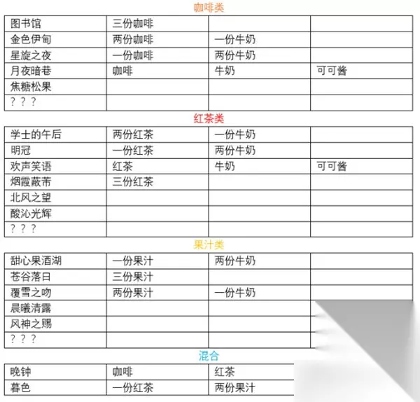 t15_2-t15_1:5.0 原神曲生酌微梦活动开始了,活动中会用到各种饮品调制配方,需要利用各种材料搭配,并且每个种类里面还有一个隐藏配方,233乐园小编为旅行者准备了全部饮品的配方大全,包括隐藏配方哦! 原神饮品调制配方大全: 饮品分为四大类,分别为咖啡类、红茶类、果汁类和混合,全部饮品配方一共21个,其中隐藏配方6个;饮品配方图鉴成功调制一次后解锁,在解锁所有饮品配方后可以获得活动名片「庆典·觥筹」。