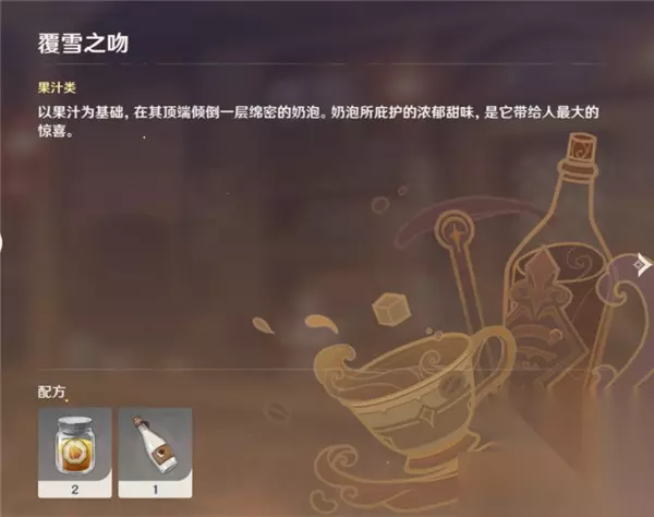 北风之望、酸沁光辉和隐藏饮品配方待解锁 果汁类 甜心果酒湖配方:一份果汁 两份牛奶