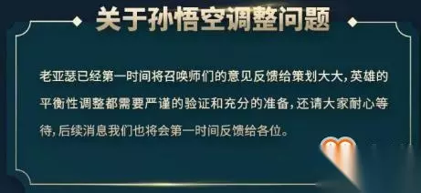 人形态的强化攻击:伤害:300(+300/LV)(+1.0Ad)→200(+200/LV)(+1.0Ad) 虎形态2技能:第一段伤害:250(+50/LV)(+1.15额外Ad)→225(+45/LV)(+1.0额外Ad) 虎形态2技能:第二段伤害:500(+100/LV)(+2.3额外Ad)→450(+90/LV)(+2.0额外Ad) 俗话说:“山中无老虎,猴子称霸王”。虽然在中高段位排位中的玩家对于猴子都有自己的克制方法,但在大部分低分段对局中,玩家配合性较差,猴子通过不断的滚雪球往往就是无解的存在。所以在王者荣耀的官博评论中也是出现了一大波“削猴党”日常打卡,官方也是第一时间给出了回应表示会持续关注。
