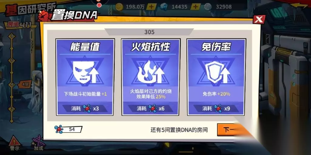 DNA置换选择顺序如下:置换优先顺序:各层危险buff抗性(如果你可以轻松过就不用置换)>暴击>暴击强度>伤害率>回复血量(视队伍血线酌情考虑),其他一概不换。当然,如果你使用的不是童弟、爆山等核心,无法保证第一回合火量,那么保证第一回合12火选择置换一些增加下次对战的火量也是很重要的。 [url=]2. 小技巧[/url] 一.每层有个危险buff,1层逃跑buff可在置换,选择降低逃跑率可让队伍无人逃跑。2层冰霜层减速buff需要速度在140以上方可比怪先出手,如图可选减速降低20,如果置换了,当前队伍只需120速就可先出手。3层灼烧buff每回合后全体受到灼烧伤害,可在3层置换箱置换降低灼烧伤害。4层冰冻buff随机冰冻一名成员,可在4层置换箱中有概率得到30%抗性未冰冻效果。5层能量降低2点每回合buff,可在5层置换降低30%可能性降低能量。6层全体角色受到针刺伤害,可在6层置换降低25%针刺伤害。7层全体角色受到真空层伤害,可在7层置换降低25%真空伤害。8层全体减速减攻击力,可在8层置换降低25%重力影响。 二.一拳通关是通到你最后过的困难难度房前面一间,例如之前三星通关至306房间,则第二天可一拳通关至305房间,因此如果想在第二天一拳通关多一间房必须当天新三星通关一个房间。特别提示,最优选择是从当前房间开始先选择挑战简单难度房间两间,再挑战困难难度的新房间,即可保证第二天比今天多一关一拳通关关数。 三.如果想要冲击困难难度房间,当前房间主力阵容不好过,比如通关会减员,或是前排耗血太多,你可以换上后补阵容,打出一定的输出,保证下次主力阵容能无伤通关该房间,然后再用主力成员去过,这样消耗会很少,并且保证自己不减员通过该困难关卡,特别提示,可以选择用6名无输出能力的角色每人带西服套,去耗一些敌人的血量,可以大大降低困难关卡的通关难度。 四.如果困难难度实在过不去了,直接转打简单房,可多过3.4间房,拿到奖励。 五.基因研究所的敌人没有控制免疫, 通关的可能性。