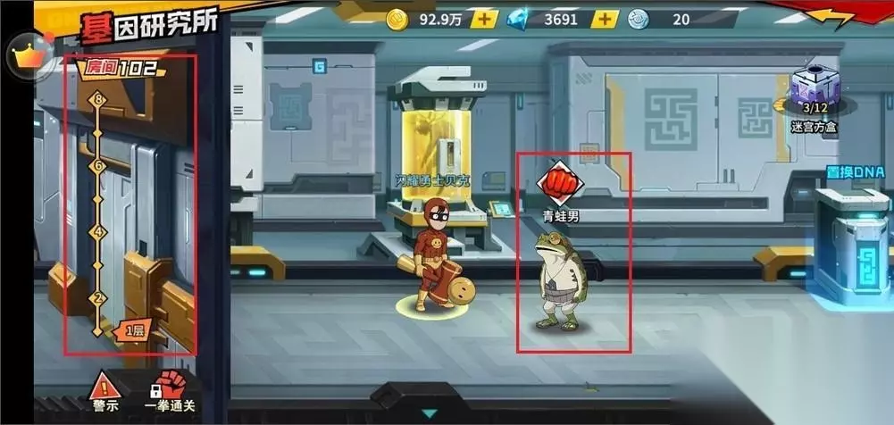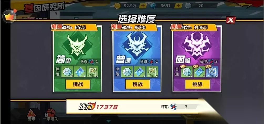 基因研究所共有8层,每层12个房间,每通过一个房间就会获得当前关卡的奖励。在进入战斗之前会选择难度,共有简单、普通、困难三个难度,大家可以根据自身的战斗力来选择,奖励依次递增。