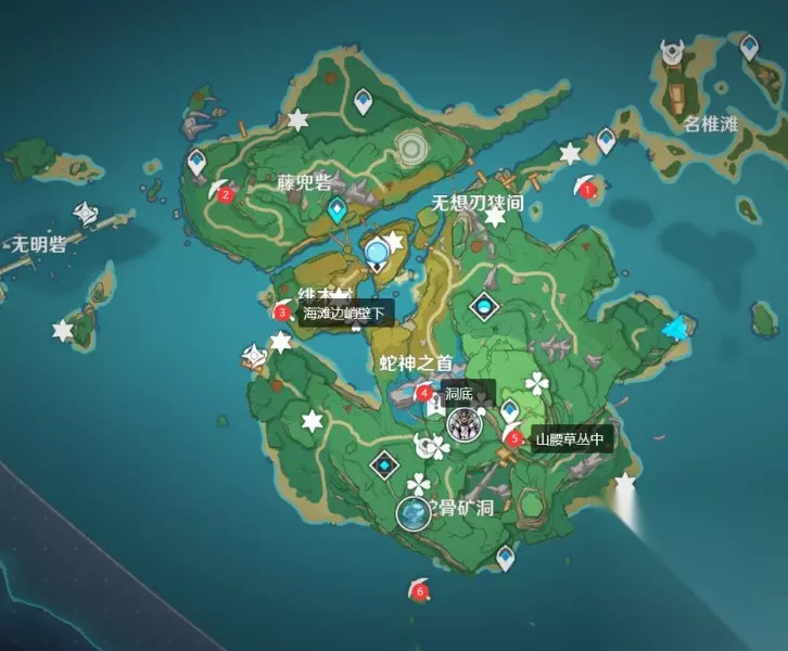 稻妻的墓碑一共有6个,图中位置都标注出来了。 其中1、2、6都好找,都在明面上; 3号墓碑在海滩边的峭壁下面; 4号墓碑在洞底; 5号墓碑在山腰的草丛中。