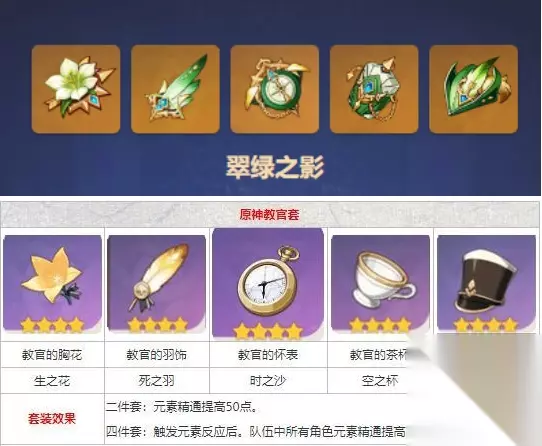 4、圣遗物可以选择翠绿之影四件套或者教官四件套都是可以的。