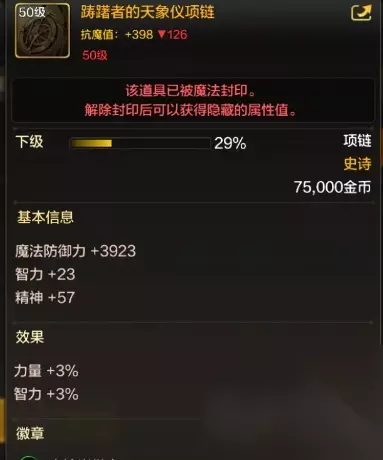 二、天仪项链介绍 1、委托:参与罗特斯团本模式通关翻拍即可获得项链; 2、装备制作:使用罗特斯精粹以及其他材料,即可制作出项链 3、项链效果介绍 智力+26 精神+66 装备效果 力量+3% 智力+3% 套装效果 攻击时几率减少敌人400防御力以及减少自身100防御力 赋予敌人眩晕异常效果以及失明异常效果、伤害增加+8%