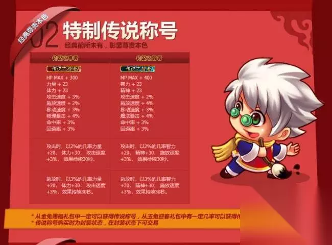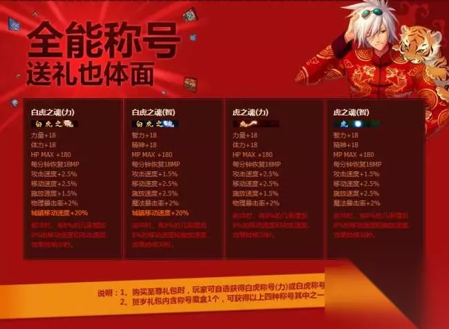 从2010年的贺岁礼包分为188、288两档。第一档可以在4个称号里随机选择其一,第二档则能自选白虎之魂力或者智。白虎之魂在那个全民PK的版本算是最强称号,以至于后来礼包下架之后称号价格疯涨,可谓称号界的传说。也是从这一年开始,越来越多的勇士开始关注贺岁礼包中的称号属性。 2011年贺岁礼包——传说之尊者、传说之智者、无双的勇士、无双的智者、英勇的斗士、英勇的智者