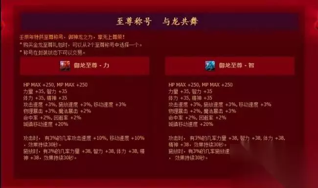 2011年贺岁礼包的价格是史上最贵的一次,最高一档688的价格在贴吧、论坛都引起过一阵热议。在称号上,传说之尊者(智者)虽说是想要刷图和PK同时兼顾,不过到头来反倒是两边都不讨好。值得一提的是,当时的388的礼包中有概率获得限量称号,游戏官网也因此被瘫痪了一段时间。 2012年贺岁礼包——御龙至尊、真龙之魂、龙的传人