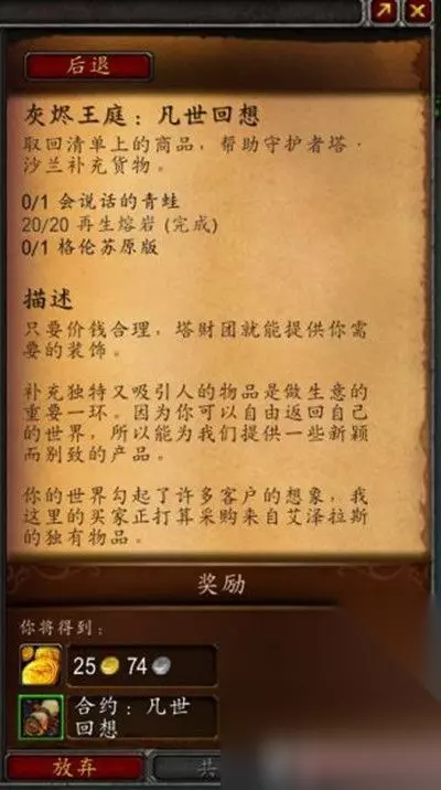 魔兽世界灰烬王庭:凡世回想任务怎么完成? 凡世回想是魔兽世界9.0版本中灰烬王庭任务线当中的一步,需要玩家取回清单上的商品,帮助守护者塔·沙兰补充货物。 灰烬王庭凡世回想任务描述:只要价钱合理,塔财团就能提供你需要的装饰。 补充独特又吸引人的物品是做生意的重要一环。因为你可以自由返回自己的世界,所以能为我们提供一些新颖而别致的产品。 你的世界勾起了许多客户的想象,我这里的买家正打算采购来自艾泽拉斯的独有物品。 所需的商品包括有:会说话的青蛙、再生熔岩、格伦苏原版。