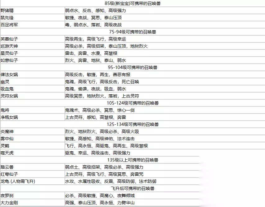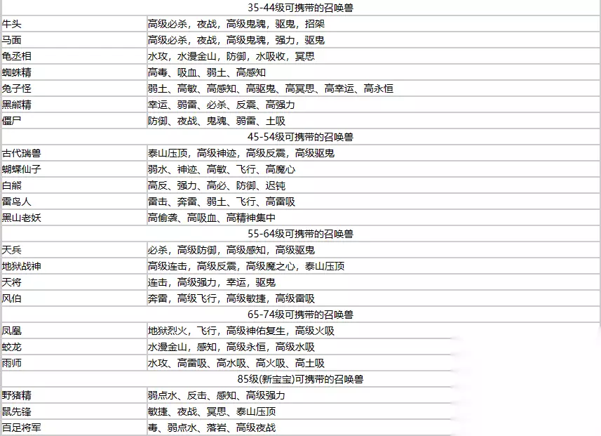 35-85级可携带的召唤兽:
