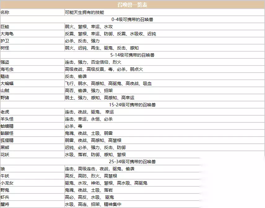 1-34级可携带的召唤兽: