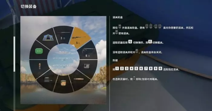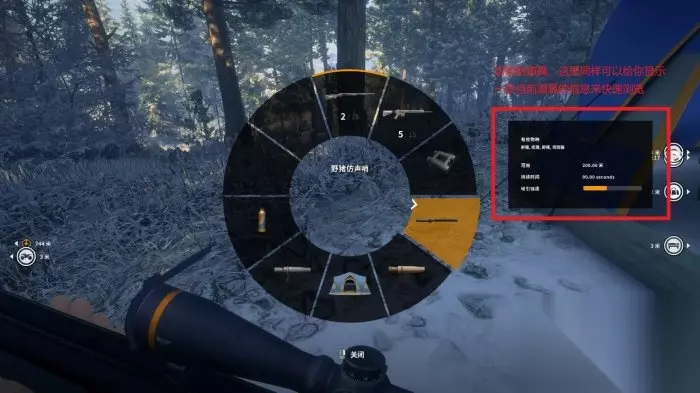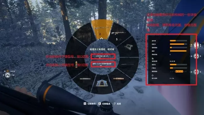 5、按住“鼠标滚轮”键,调出道具轮盘,来实现快速切换倍镜和弹药类型 看过上面的快速装卸倍镜,这个时候就又有人要问了,我经常背包放多个倍镜,比如1-4X,4-8X,8-16X啊什么的,那能不能快速切换呢?答案是可以的,不仅如此,你还能同时快速切换不同类型的弹药来应对不同的动物。 你只需要按住“鼠标滚轮”键,调出道具轮盘(有点类似gta和荒野大镖客的武器轮盘选择),让箭头指向你想选择的武器,然后同时按“E”键来切换该武器的多种倍镜,按“Q”键来切换该武器的弹药类型。这样是不是方便了很多,就不用你再一步步打开装备栏来切换倍镜和弹药了。让你做到任何情况下都能快速拿出合理的武器、弹药和倍镜,来面对当前的猎物。