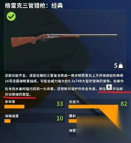6、长按“R”切换同一枪中同时装载的不同类型子弹 有些枪能在一把枪中同时装载两种的类型子弹,比如上图的"格雷克三管猎枪“(也是游戏中一把非常实用的霰弹枪,能打所有等级的子弹),就能同时装载一发步枪子弹,两发霰弹枪子弹,共三发弹容。通过长按“R”就能做到快速切换你当下要射击的子弹型号,以便处理不同距离和类型的动物。