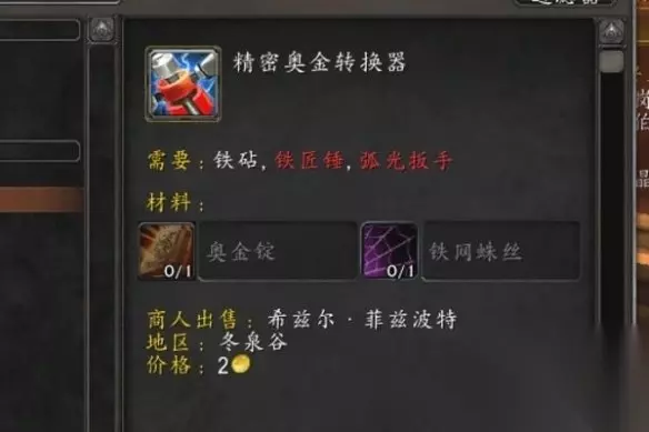 魔兽世界精密奥金转换器是游戏中的工程学专业制作物品,我们需要在得到图纸之后,才可以制作精密奥金转换器,精密奥金转换器是非常重要的材料,可以作为任务提交材料,也可以作为武器制作材料。 魔兽世界精密奥金转换器哪里有 1、精密奥金转换器是工程专业制作的物品,需要我们获取图纸后制作得到。 2、图纸的位置就在【冬泉谷-永望镇】的希兹尔·菲兹波特处,直接购买即可得到。