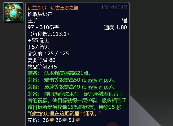第一件装备是橙锤瓦兰奈尔远古王者之锤,这件传说级的武器虽然特效强大,但是受限于物品等级,综合属性仅仅与270装等左右的史诗级奶锤相当,这意味着它成为了魔兽世界历史上第一把在资料片末期被淘汰的武器,真是非常可惜。