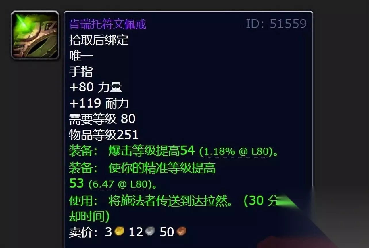 第二件装备是肯瑞托戒指,上图是物理版本,实际拥有4个版本。这件戒指的设计目的就是回收金币,从初始200装等可以提升到251点,玩家一共需要花费12250金。可惜由于后期物品等级膨胀,251戒指上线的时候玩家的主力装备已经达到了264+277,这件戒指除了可以回城,几乎没有任何实际意义,很少有玩家会花大价钱升满,暴雪的目的也没有达到。 但是现在砍了ICC掉落的装等,ICC开放的时候玩家的主流装备还是245+251,这意味着这枚点击就送的肯瑞托戒指价值大增,非常适合玩家入手一枚用来开荒HICC。基于小探对暴雪的了解,这枚戒指的装等一定不会削弱,暴雪就等着大家花费大笔金币呢。 奎尔德拉之剑