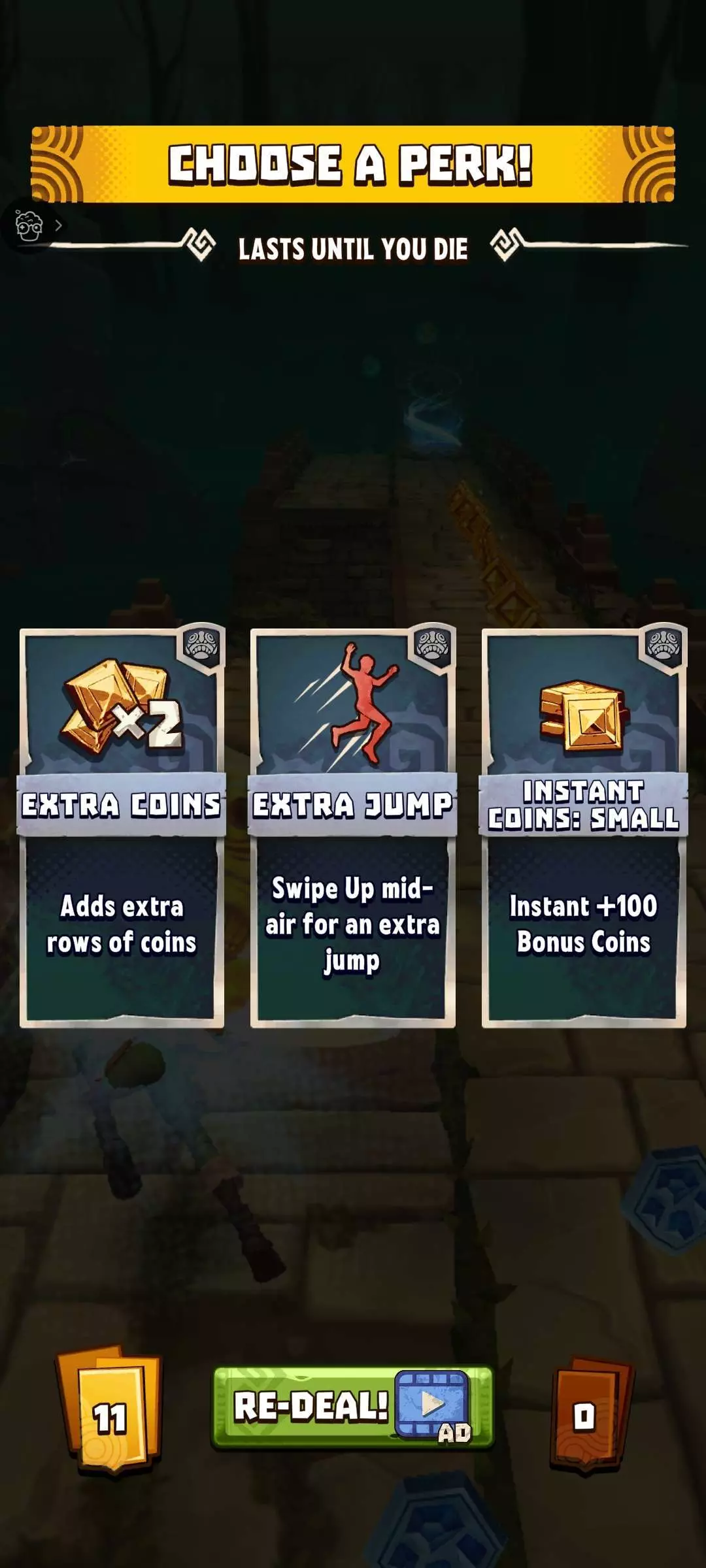 关于游戏中肉鸽三选一,本应该是个可以快速给个爽感反馈的,但可惜本作并没有,首先语言是英语、导致国内新手玩家第一时间不容易明白因子什么作用;就算真的明白了其意思,也会发现只是增加一排额外金币、即时+100硬币奖励、可以获得额外的跳跃等这些,放在《地铁跑酷》里就是金币翻倍、超级跑鞋这种,实属爽不起来啊。