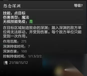伤害仅仅只是用来打断而已,100点伤害在后期几乎可以忽略。 但是,无视魔免的2.5秒控制,这个就很关键了。 在后期,只有短短5秒的BKB时间,被深渊这个技能给缩短了2.5秒,这无异于让依赖BKB生存的英雄进一步缩小的生存空间,这在后期的团战中是很重要的。