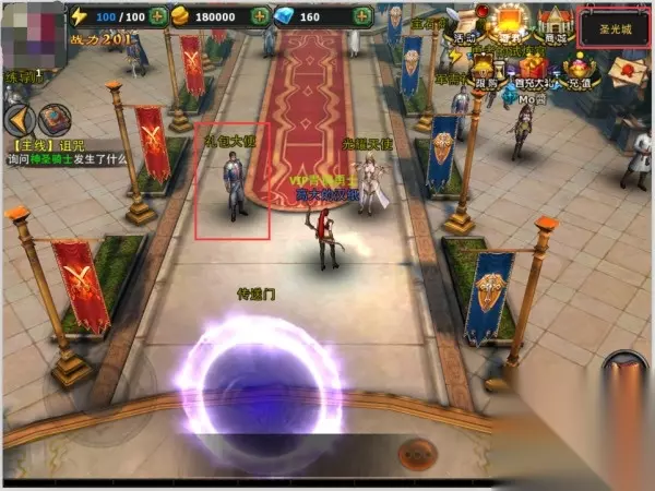 《暗黑黎明》礼包卡激活流程: 卡的使用时间:2014年11月13日11:00-2014年11月20日11:00 1.登录游戏后,点击右上角的小地图,选择【圣光城】 2. 在圣光城中央传送门的上方可以找到NPC【礼包大使】