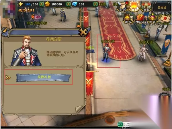3.点击礼包大使,选择【兑换礼包】,在兑换码输入框内输入兑换码 4.兑换成功后,可在角色包裹中查看礼包。