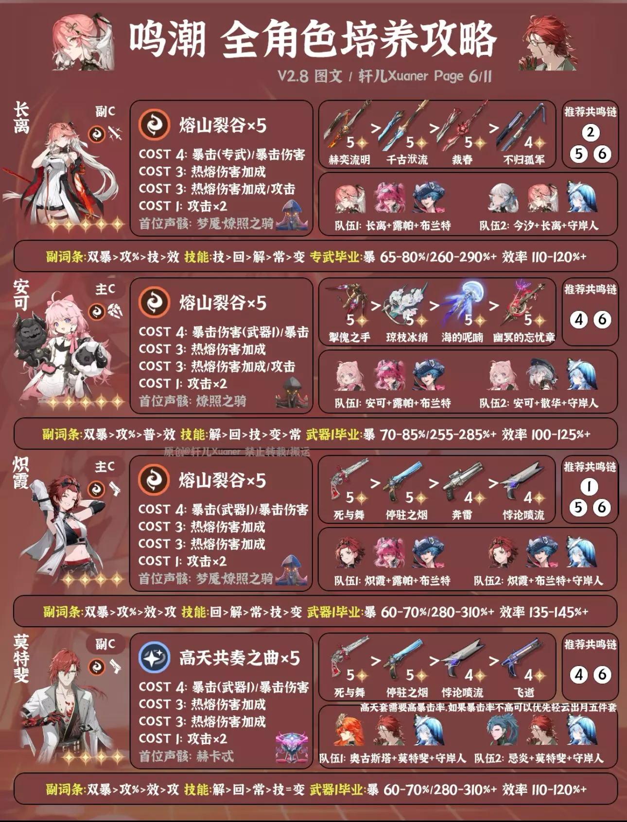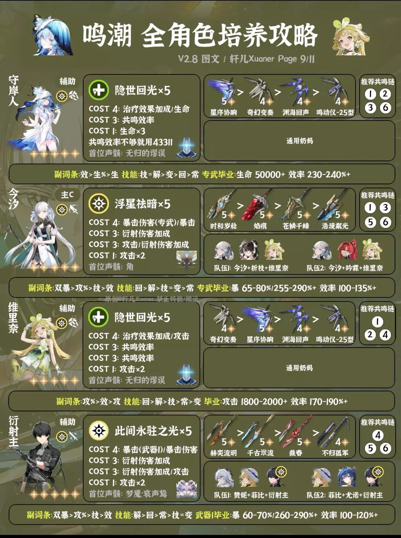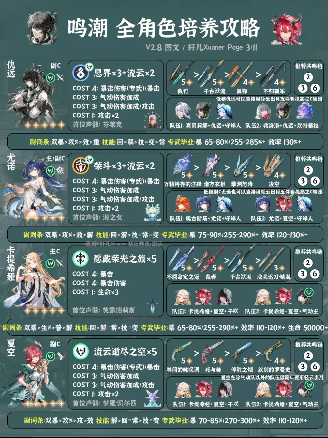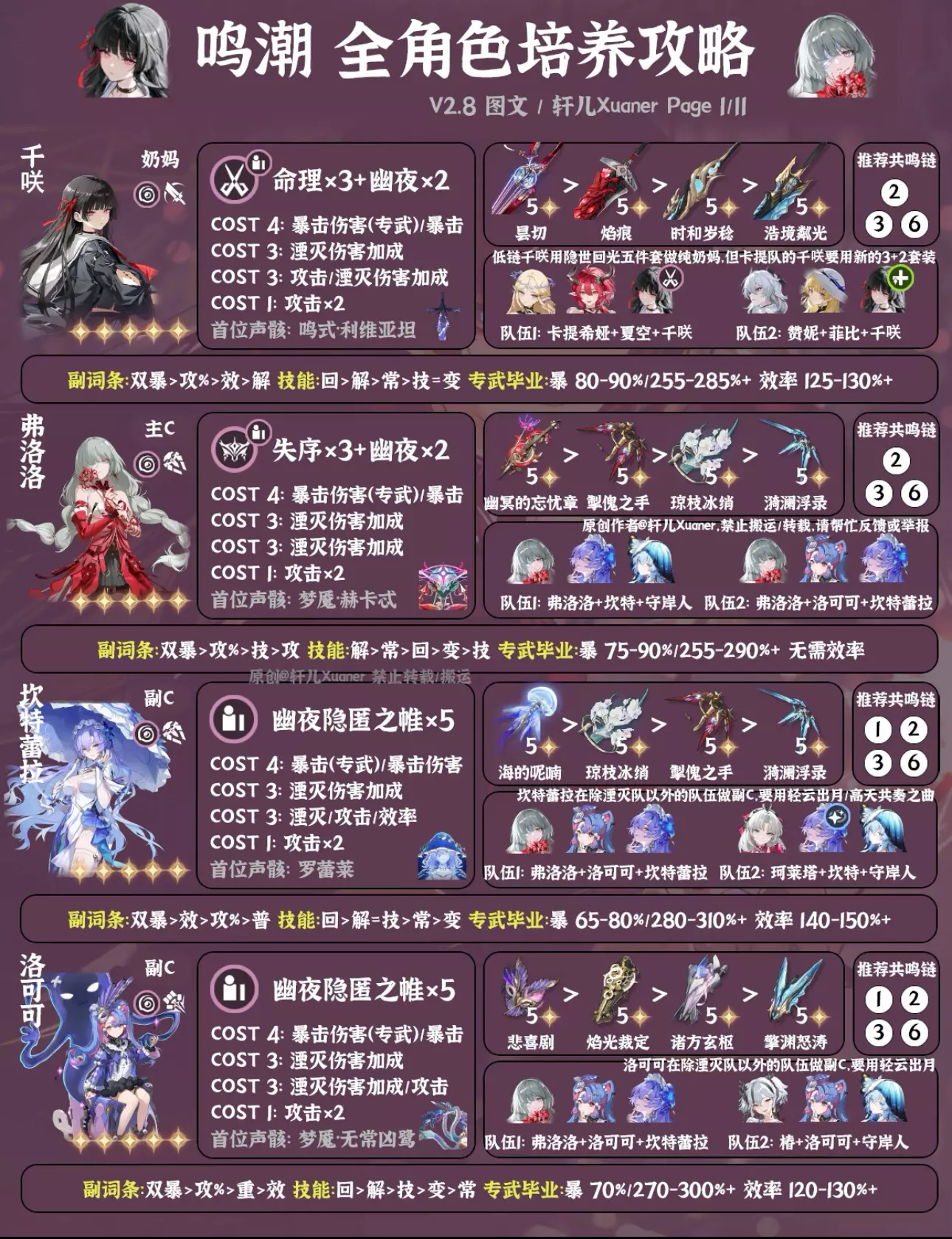 鸣潮最新2.8版本全角色培养一图流来了,截至千咲共计42名角色。后续全角色培养一图流固定在新版本上半更新,方便入坑的漂泊者使用。下次更新预计在年底3.0上线后。 ---------------------- 更新内容 ① 新增千咲。 ② 卡提希娅、夏空、尤诺、弗洛洛、赞妮、菲比等推荐配队做部分调整。 ③ 仇远、尤诺、吟霖、莫特斐、菲比等副C新增备注:低链纯做辅助用可以用轻云出月五件套。 ④ 湮灭主首位声骸由无妄者改为梦魇·无冠者。 ---------------------- 攻略食用指南 ① 本篇内容大家可自己保存留用,但禁止搬运。 ② 角色先后顺序无意义,同属性角色放在一起,新角色会放在前面。 ③ 声骸和配队均为最常用方案,特殊声骸套装会标注。部分副C角色如果只是低链做辅助用,可以直接用轻云出月五件套,会提升主C和队伍伤害。如需要查看更多配队,请参考角色具体培养一图流和配队详解。 ④ 武器按照优先级推荐4把,毕业属性以专武或第一把武器计算,如果使用其它武器可自行换算下。一般情况下,武器属性为暴击,COST4使用暴击伤害;武器属性为暴击伤害,COST4使用暴击。毕业属性达到图中数值范围即可使用,数值大小根据自己角色培养计划进行安排。 ⑤ 目前通用奶妈一般使用守岸人,可根据自己卡池和配队安排更换。 ⑥ 为方便展示空间,部分名词进行了简写,如:双暴(暴击+暴击伤害)、回(共鸣回路)、解(共鸣解放)、技(共鸣技能)、常(常态攻击)、变(变奏技能)、攻%(百分比攻击/大攻击)、攻(攻击/小攻击)。 ⑦ 角色定位与角色强度排行榜进行了统一处理,只分为主C、副C和辅助三类。 ⑧ 仅供参考,如有优化建议可提出。 #鸣潮 #鸣潮攻略 #鸣潮创作激励 #鸣潮千咲 #鸣潮奔往琥珀之都 #踏上鸣日的征程