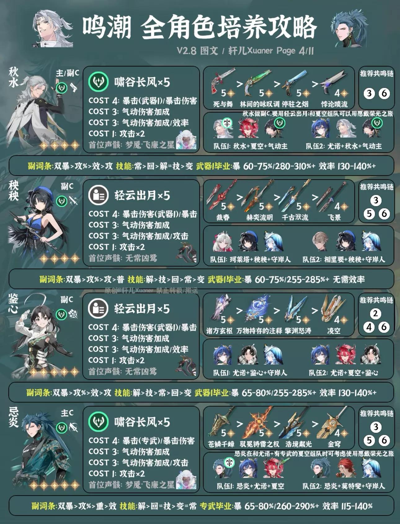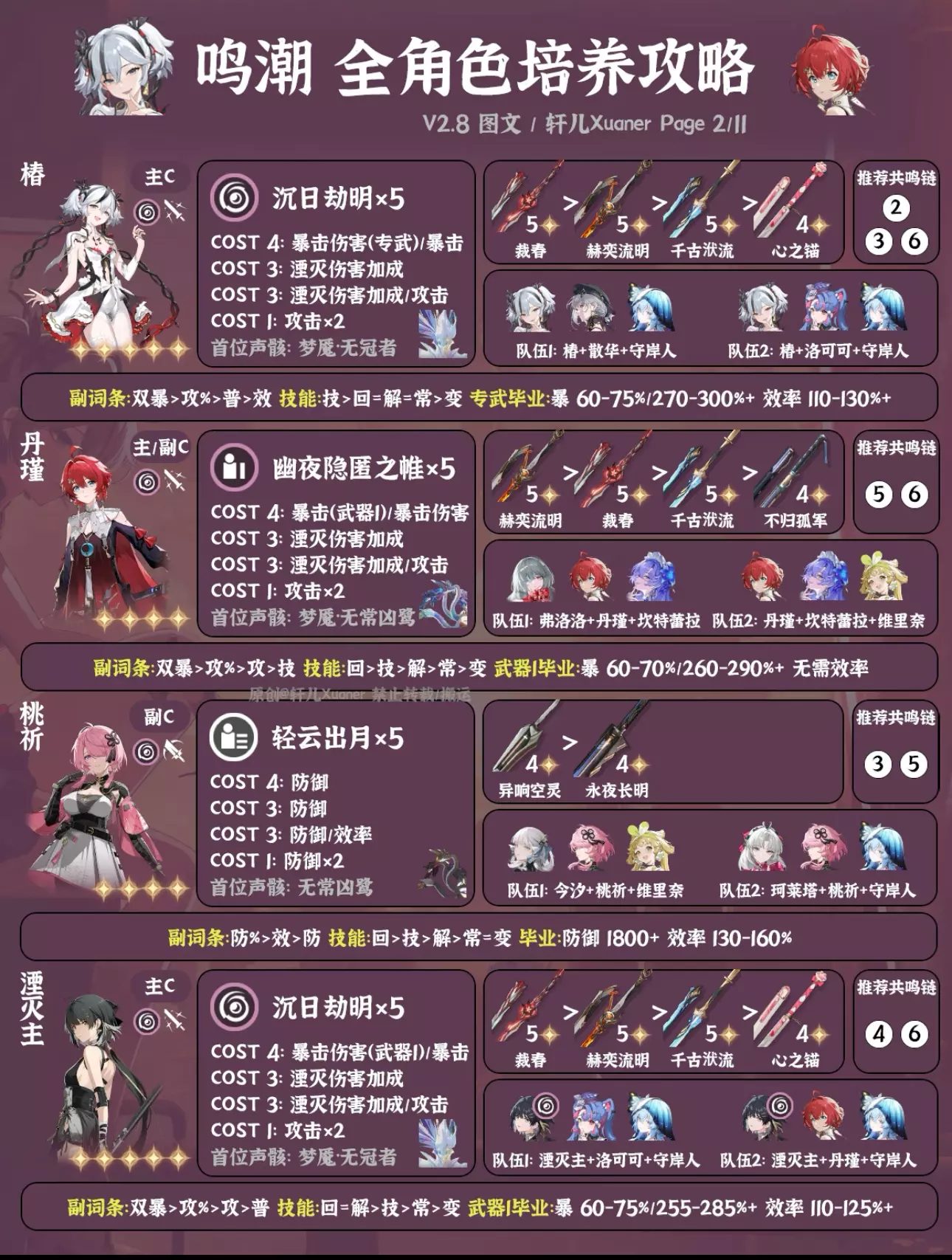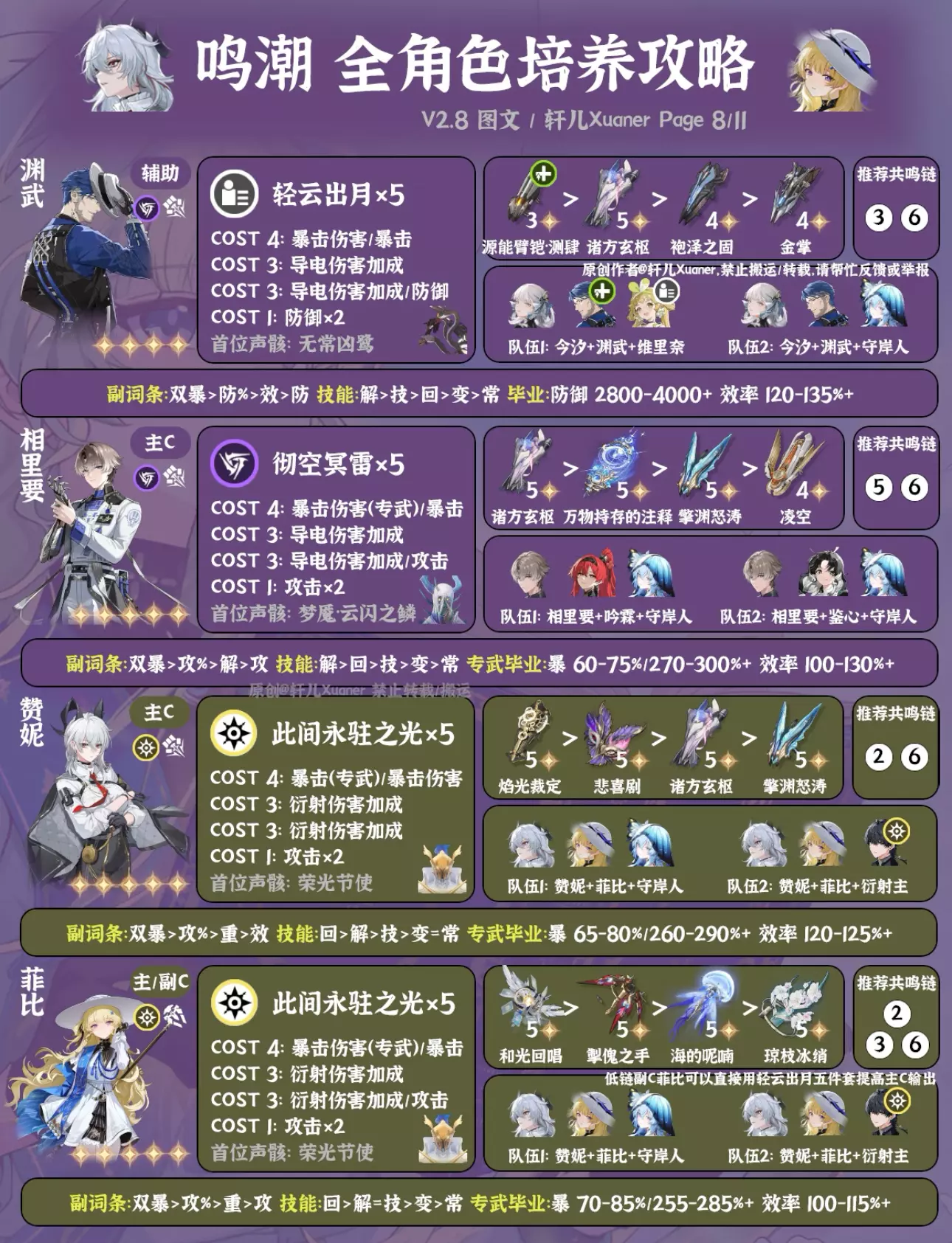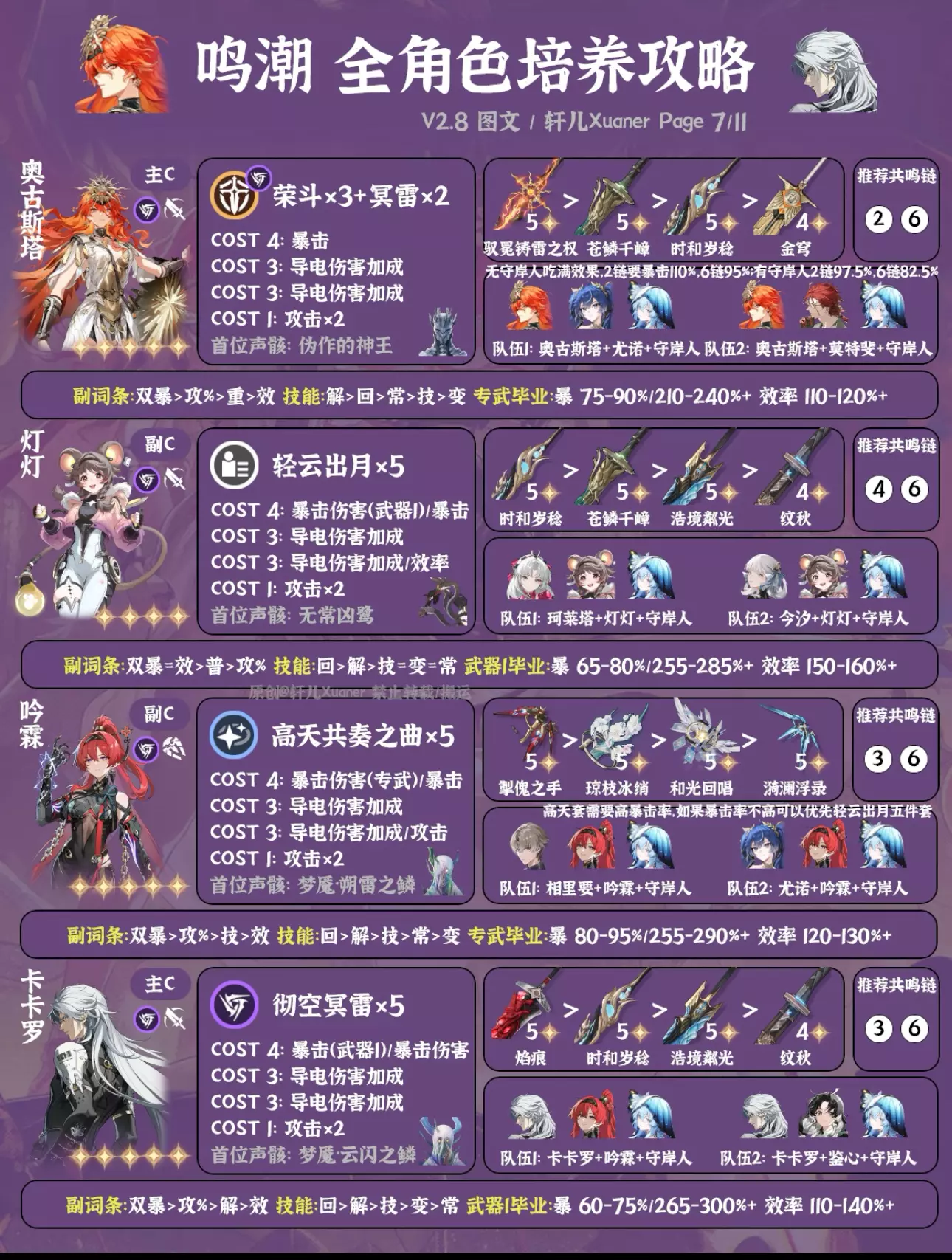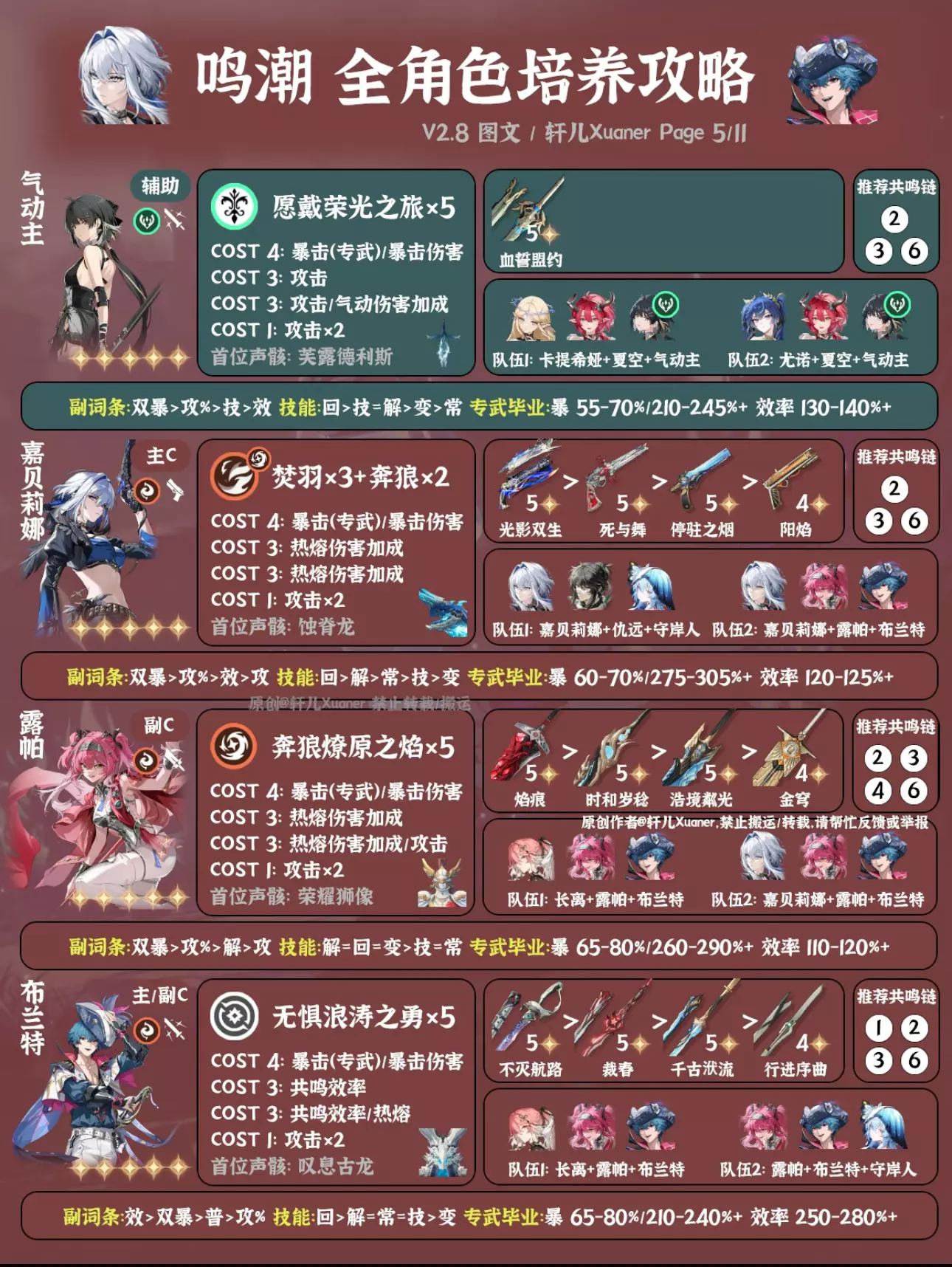 鸣潮最新2.8版本全角色培养一图流来了,截至千咲共计42名角色。后续全角色培养一图流固定在新版本上半更新,方便入坑的漂泊者使用。下次更新预计在年底3.0上线后。 ---------------------- 更新内容 ① 新增千咲。 ② 卡提希娅、夏空、尤诺、弗洛洛、赞妮、菲比等推荐配队做部分调整。 ③ 仇远、尤诺、吟霖、莫特斐、菲比等副C新增备注:低链纯做辅助用可以用轻云出月五件套。 ④ 湮灭主首位声骸由无妄者改为梦魇·无冠者。 ---------------------- 攻略食用指南 ① 本篇内容大家可自己保存留用,但禁止搬运。 ② 角色先后顺序无意义,同属性角色放在一起,新角色会放在前面。 ③ 声骸和配队均为最常用方案,特殊声骸套装会标注。部分副C角色如果只是低链做辅助用,可以直接用轻云出月五件套,会提升主C和队伍伤害。如需要查看更多配队,请参考角色具体培养一图流和配队详解。 ④ 武器按照优先级推荐4把,毕业属性以专武或第一把武器计算,如果使用其它武器可自行换算下。一般情况下,武器属性为暴击,COST4使用暴击伤害;武器属性为暴击伤害,COST4使用暴击。毕业属性达到图中数值范围即可使用,数值大小根据自己角色培养计划进行安排。 ⑤ 目前通用奶妈一般使用守岸人,可根据自己卡池和配队安排更换。 ⑥ 为方便展示空间,部分名词进行了简写,如:双暴(暴击+暴击伤害)、回(共鸣回路)、解(共鸣解放)、技(共鸣技能)、常(常态攻击)、变(变奏技能)、攻%(百分比攻击/大攻击)、攻(攻击/小攻击)。 ⑦ 角色定位与角色强度排行榜进行了统一处理,只分为主C、副C和辅助三类。 ⑧ 仅供参考,如有优化建议可提出。 #鸣潮 #鸣潮攻略 #鸣潮创作激励 #鸣潮千咲 #鸣潮奔往琥珀之都 #踏上鸣日的征程