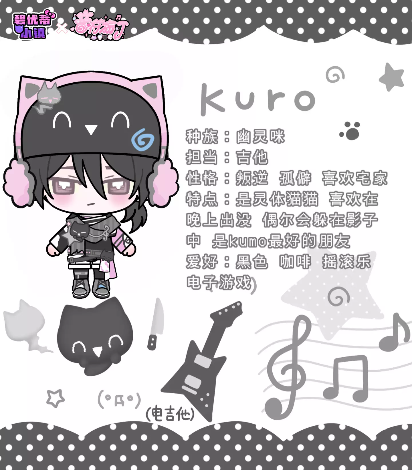 kuro戴上猫耳帽和毛绒耳罩,黑白粉冬装又酷又暖,是只只在夜里开场的幽灵咪电吉他手喵♪