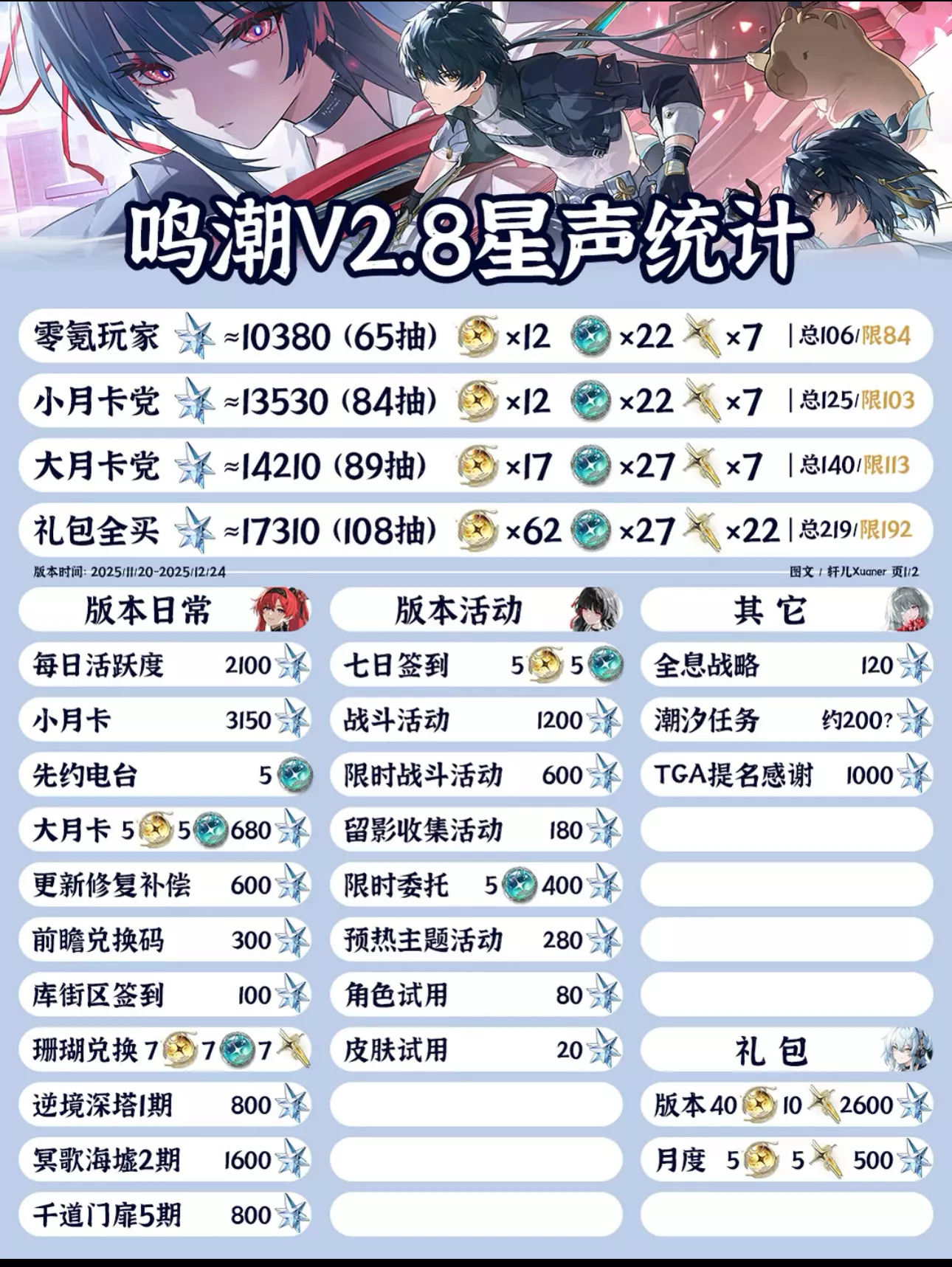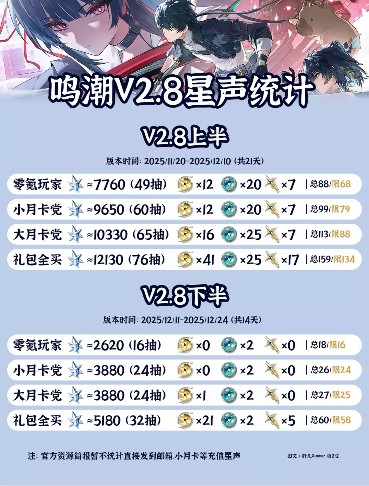 鸣潮V2.8版本的星声统计来啦,TGA提名发放1000星声!!恭喜鸣潮!这次轩儿Xuaner根据大家的反馈继续优化了新模板,总抽数分为包含蓝球和不包含蓝球两个版本,各位漂泊者各取所需~上下半各自星声统计请查看第二页~ ------------------------------ ① 2.8版本共有两位新共鸣者上线,分别是千咲(五星湮灭长刃)和卜灵(四星导电音感仪),菲比(衍射音感仪)、弗洛洛(湮灭音感仪)和坎特蕾拉(湮灭音感仪)也会复刻,大家根据各自卡池合理分配资源和抽卡。 ② 千咲目前主要就业在卡夏队,替代气动主,预计后续异常效应队会有就业,如果玩卡提或是喜欢JK可以抽。菲比主要是赞妮刚需,玩赞非需要补。弗洛洛和坎特蕾拉是固定搭档,根据自己的卡池补充或者一起抽一个新队,0+1弗洛洛和0+0坎特蕾拉起步。 ③ 当前星声是根据已公布信息推测整理,请以实际上线后数量为准~ #鸣潮 #鸣潮攻略 #鸣潮创作激励 #鸣潮千咲 #鸣潮卜灵 #鸣潮奔往琥珀之都 #鸣潮星声 #踏上鸣日的征程