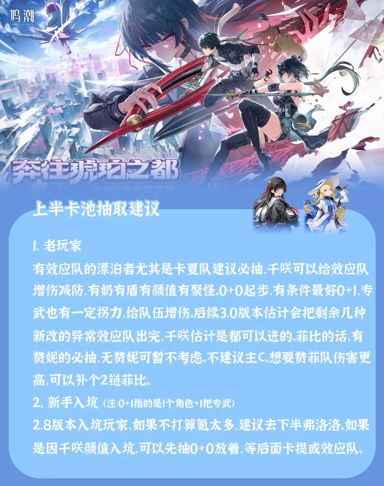 鸣潮2.8版本本周四更新,这一次卡池该如何抽取呢?轩儿Xuaner这边给各位一点小小的建议,仅供参考~ ------------------------------------- 2.8上半卡池:千咲+菲比 2.8下半卡池:弗洛洛+坎特蕾拉+卜灵(四星) ------------------------------------- ① 共鸣链推荐:千咲请关注上线后轩儿的一图流,作为辅助预计是2链会有不错的提升,菲比2/3/6链,弗洛洛2/6链,坎特蕾拉1/2/3/6链。 ② 老漂:依旧根据自己卡池决定。如果你有效应队(卡提夏空/赞妮菲比),尤其是卡夏队,建议优先去抽千咲,0+0或者0+1起步,专武对队伍有增伤。如果无效应队,建议优先去补齐弗坎队,缺坎特蕾拉补坎特蕾拉,或者给弗洛洛补2链。坎特蕾拉如果你有其它五星音感仪可以用,可以优先抽1链提升手感。不喜欢坎姐的话,那弗洛洛单走必须得有2链。如果是主玩赞菲的,建议补菲比0+0/0+1/2+1,赞菲队是中高链比较舒适,如果想投资,也可以给赞妮补一补,卡池还没有结束。 ③ 新漂:建议优先0+1弗洛洛和0+0坎特蕾拉,这三金必须拿下,然后多余资源再给0+0千咲,留给未来的效应队用。 #鸣潮 #鸣潮攻略 #鸣潮创作激励 #鸣潮千咲 #鸣潮卜灵 #鸣潮奔往琥珀之都 #鸣潮抽卡 #鸣潮弗洛洛 #踏上鸣日的征程 #鸣潮菲比