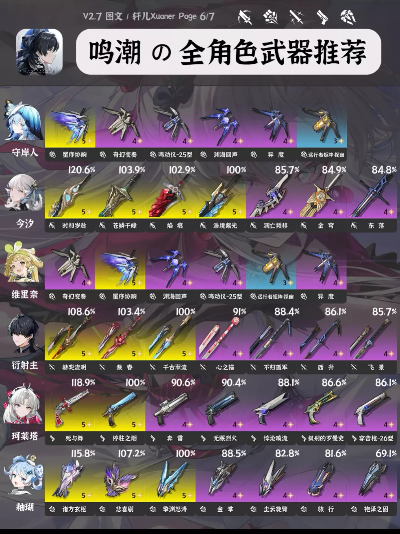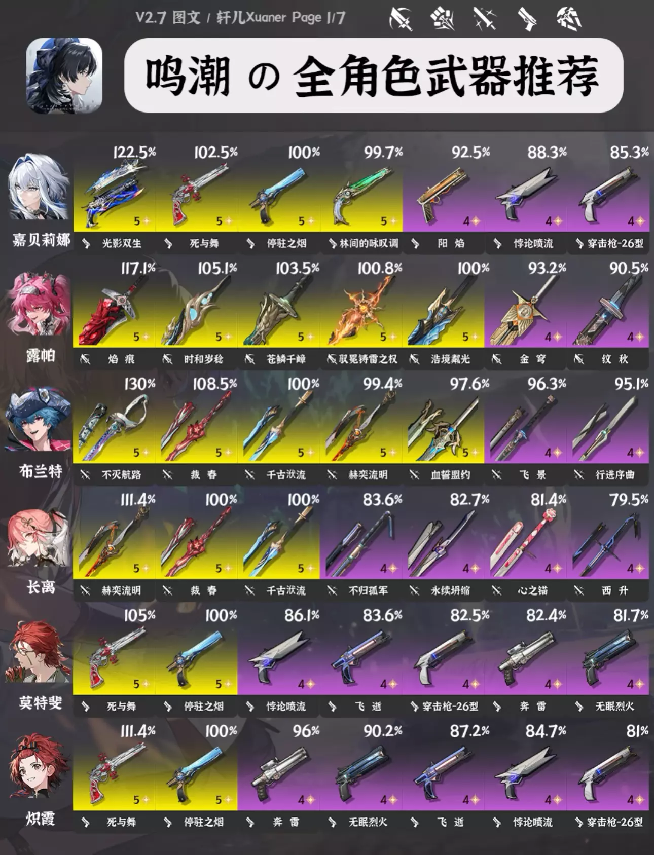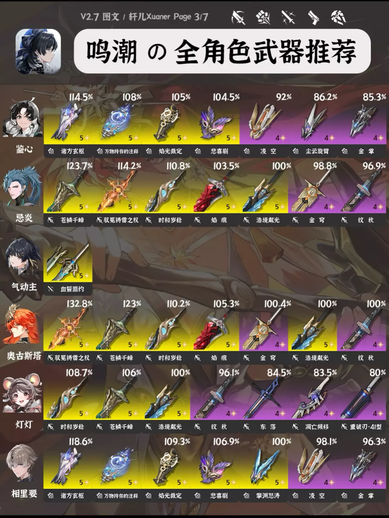 攻略食用指南 ① 由于目前鸣潮武器也多了起来,所以每个角色会推荐7把武器,让各位选择更多。 ② 目前部分角色部分武器数据还未进行梳理,可能有一些老角色未推荐合适的新武器,后续会逐步更新。 ③ 武器右上方百分比数字为角色携带该武器个人伤害体现,大部分角色以常驻五星武器为100%基准。武器按照优先级排序。 ④ 奶妈生存类角色不提供百分比数值,不看伤害。 ⑤ 部分角色在不同使用场景不同配队中武器的优先级可能存在不同,请结合实际配队参考 #鸣潮 #鸣潮攻略 #鸣潮创作激励 #鸣潮嘉贝莉娜 #鸣潮武器 #鸣潮暗潮将映的黎明 #鸣潮黎那汐塔 #踏上鸣日的征程 #鸣潮入坑指南