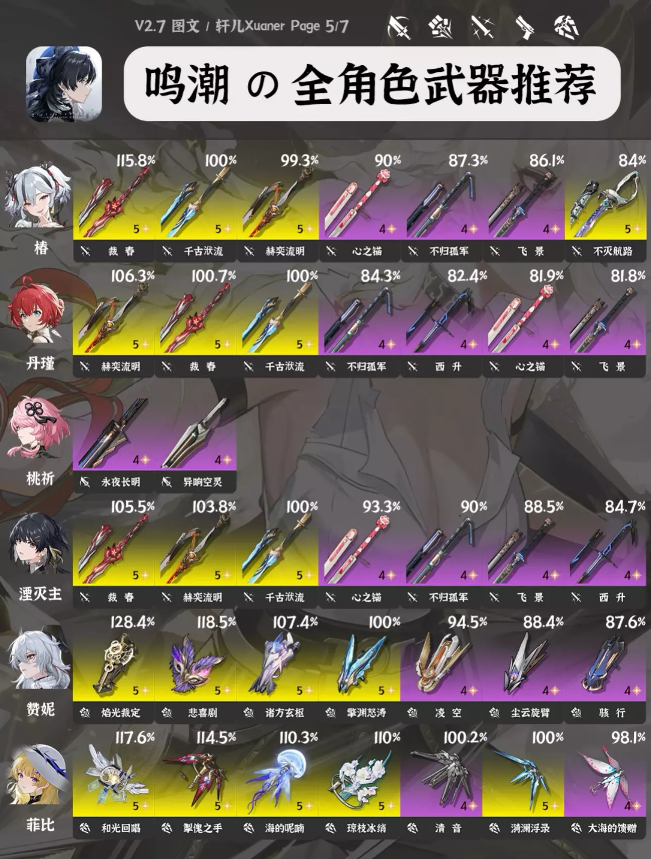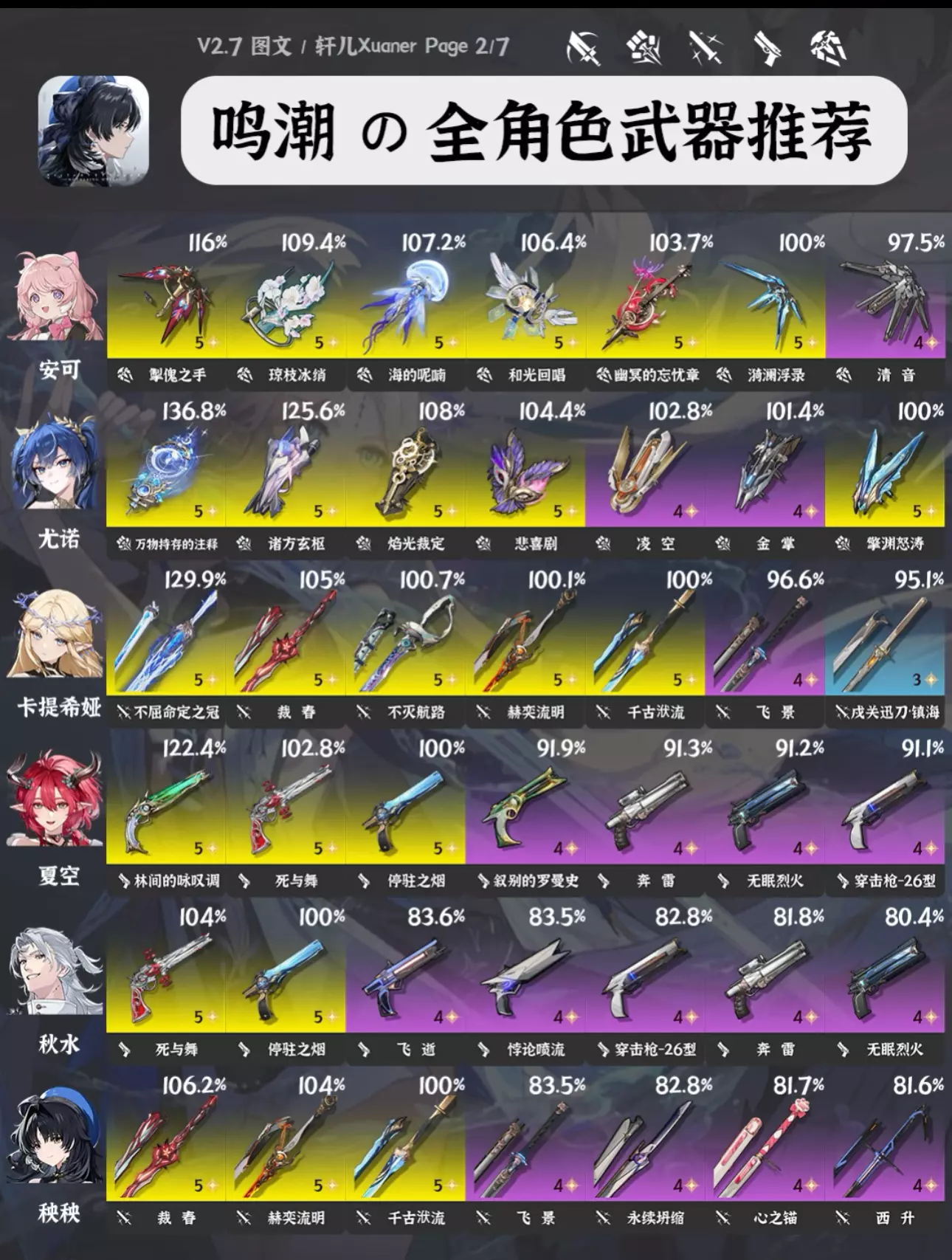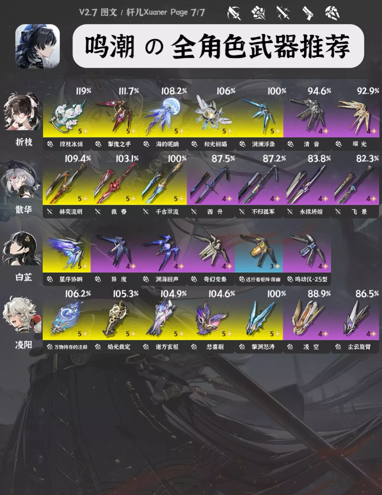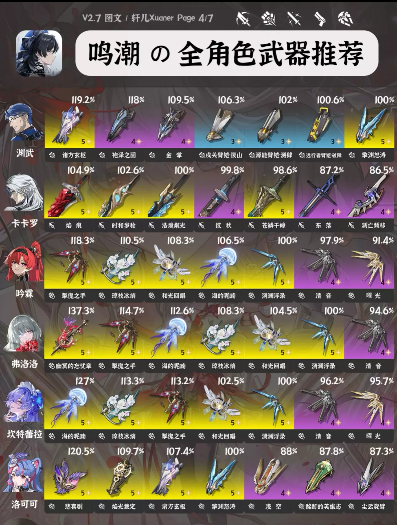 攻略食用指南 ① 由于目前鸣潮武器也多了起来,所以每个角色会推荐7把武器,让各位选择更多。 ② 目前部分角色部分武器数据还未进行梳理,可能有一些老角色未推荐合适的新武器,后续会逐步更新。 ③ 武器右上方百分比数字为角色携带该武器个人伤害体现,大部分角色以常驻五星武器为100%基准。武器按照优先级排序。 ④ 奶妈生存类角色不提供百分比数值,不看伤害。 ⑤ 部分角色在不同使用场景不同配队中武器的优先级可能存在不同,请结合实际配队参考 #鸣潮 #鸣潮攻略 #鸣潮创作激励 #鸣潮嘉贝莉娜 #鸣潮武器 #鸣潮暗潮将映的黎明 #鸣潮黎那汐塔 #踏上鸣日的征程 #鸣潮入坑指南