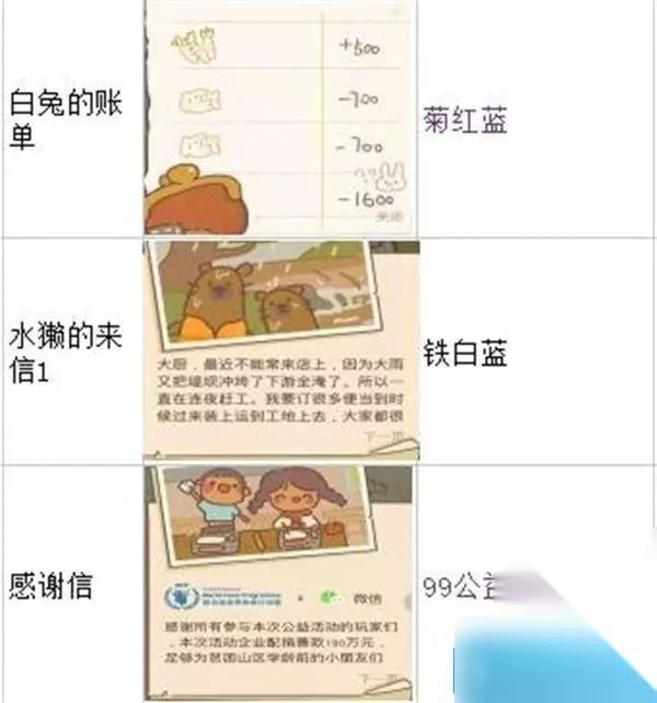 刀疤熊的回忆:小雏菊、向日葵、红玫瑰; 水獭的信1:铁水壶,白玫瑰,蓝色风铃; 水獭的信2:铁水壶、蓝色风铃、白玫瑰; 野餐照片:白玫瑰、种子、金水壶; 派对狗的信:向日葵、红玫瑰、蓝色风铃; 爱丽丝故事书1:蓝色风铃、樱花、金壶/蓝色风铃,铜壶、金壶; 小狐狸的信:向日葵、铁水壶、种子(小狐狸来后才能得到2、3个字母); 手帐的最后一页:蓝色风铃、樱花、白玫瑰/雏菊、蓝色风铃,白色玫瑰/雏菊*3/雏菊、向日葵、蓝色风笛; 狐狸日记2:向日葵、红玫瑰、四叶草*2/4、红玫瑰,四叶草*2、向日葵; 另一页手帐:向日葵、红玫瑰、蓝色风铃; 相机狗的来信(先解锁相机狗):向日葵、红玫瑰、铜水壶/红玫瑰、蓝色风铃、铜水壶; 爱丽丝故事书2:向日葵、白玫瑰、红玫瑰/小雏菊*3 白玫瑰兔的喙:小雏菊,红玫瑰,蓝色风铃; 手帐第一页:羊驼:小雏菊、红玫瑰、蓝铃/向日葵、红玫瑰,蓝铃/小雏菊、向日葵、红蔷薇 边牧的信——边牧的明信片 柴郡猫——爱丽丝1——爱丽丝2 摄像小狗——摄像小狗的来信 柴犬的信——72小时柴犬婚礼订单完成——柴犬小宝照片 派对小狗的回信——新西兰1——新西兰2——小C——一页旧手账——最后一页手账 野餐照片——毛豆——小狐狸的信(最好将解锁冷荞面的小鱼干攒好,狐狸信来了后解锁菜品趁热召唤更容易召唤过来小狐狸) 小雏菊=菊.向日葵=黄.红玫瑰=红.蓝风铃=蓝.白玫瑰=白.樱花=樱.四叶草=绿.任意一种花=x 水壶有三种:铁 铜 金