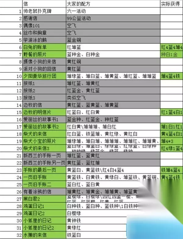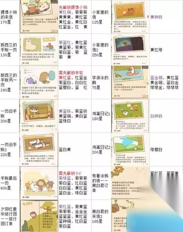 特殊信件 学游泳的鹅: 4级蓝+金水壶+铜水壶 4级四叶草3朵 一页旧手账: 白+黄+铁水壶 4级黄+4级蓝+铁水壶 蓝+绿+白 手账的最后一页: 4级小雏菊3朵 4级菊+种子+4级蓝 4级红+2级白+4级蓝 4级菊+4级黄+4级蓝 4级白+4级白+4级蓝 新西兰的手账一页: 4级菊+2级红+4级蓝 4级小雏菊3朵 红+白+蓝 红+种子+铜水壶 新西兰的手账另一页: 4级黄+4级蓝+4级红 红+白+蓝 红+种子+铜水壶 野餐的照片: 蓝+种子+金水壶 种子+3级白+金水壶 种子+1级白+金水壶 3级红+3级蓝+1级白 白兔的账单: 4级菊+4级红+4级蓝 4级红+4级菊+4级蓝 爱丽丝的故事书1: 蓝+樱+金水壶 4级红+金水壶+4级蓝 4级蓝+金水壶+种子 3级红+金水壶+3级蓝 红+蓝+金水壶 金水壶+蓝+金水壶 爱丽丝的故事书2: 4级黄+3级白+4级红 3级菊+2级白+3级红 4级黄+4级红+4级白 4级黄+2级白+4级红 摄像小狗的来信: 4级黄+4级红+铜水壶 铜水壶+4级菊+4级红 4级黄+铜水壶+4级红 边牧的明信片: 4级白+1级白+4级红 4级红+4级蓝+白 4级菊+4级黄+4级红 边牧的信: 4级菊+4级红+3级蓝 1级黄+4级红+1级蓝 派对小狗的回信: 4级蓝+4级红+4级黄 4级菊+4级红+4级蓝 帅老鼠扑克牌: 季节限定-儿童节礼物 (只能等明年啦!) 夕阳红豪华旅行团: 小雏菊三朵 金水壶三个 红+蓝+金水壶 菊+黄+蓝 有着涂鸦的信: 红+黄+铜水壶 偶像101: 铁水壶+金水壶+铜水壶 种子+种子+铁水壶 柴犬的来信(柴犬结婚): 红+白+蓝 菊+白+菊 蓝+樱+白 红+樱+白 红+白+金水壶 蓝+白+金水壶 报纸1: 铁水壶+铜水壶+金水壶 报纸2: 4黄+4红+3蓝 4菊+4红+4蓝 丝巾和胸章: 4级红+4级蓝+种子 4级白+种子+X 4级白+4级白+4级蓝 小狐狸的信: 黄+铁水壶+种子 柴犬小宝: 小雏菊3朵 白+白+红 黄+蓝+白 菊+菊+黄 黄+红+蓝 菊+黄+白 白+绿+金水壶 4菊+1白+4菊