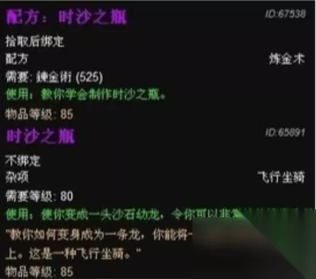 配方:时沙之瓶 获取方式:需要考古学450,奥丹姆挖掘托维尔文物,挖到坎努匹克陶罐后,有低几率开出。坎努匹克陶罐只能由炼金职业的才能打开; 制作条件:需要炼金术达到525,即可制作时沙之瓶; 所需材料:1*燃钢水晶瓶、8*时之砂、12*真金、8*风行合剂、8*泰坦之力合剂、8*深石之油。