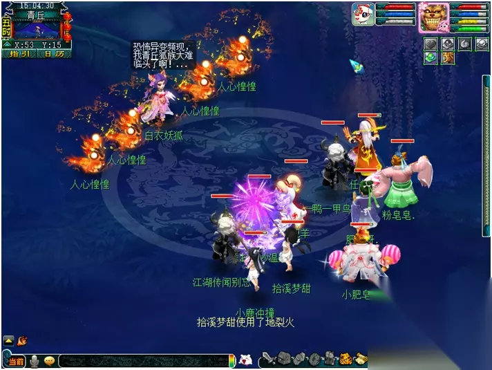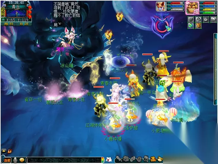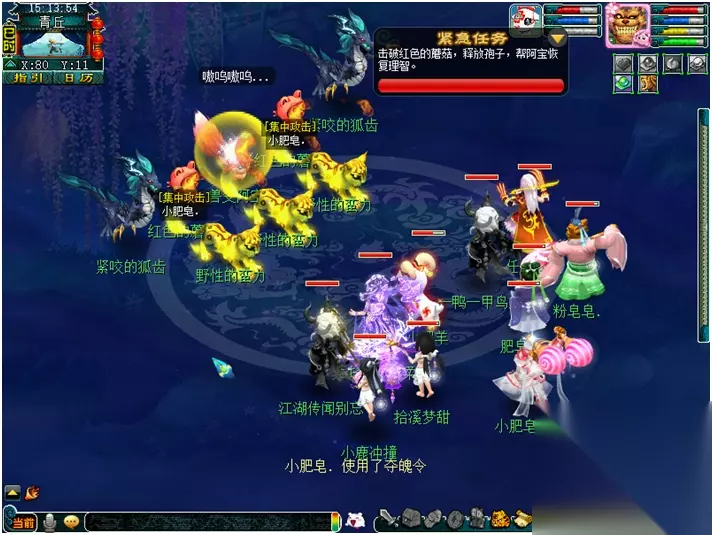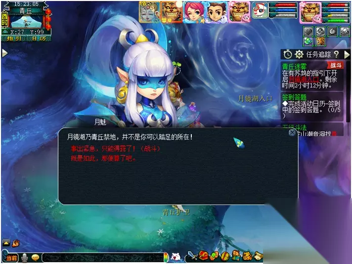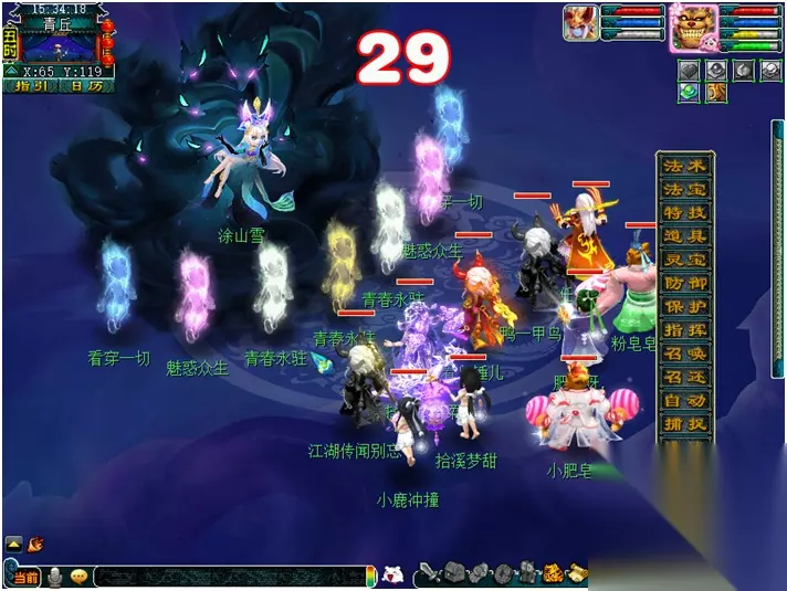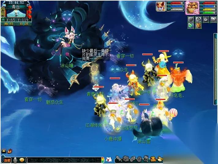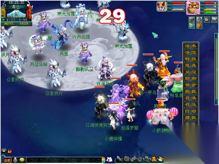 【月镜湖的战斗】 月魅:每隔2回合会喊话敌方怪出击。依次是:风清月朗-寒光如爽-众星拱月-全部单位 众星拱月(黑山造型):月影之威(物理攻击4个单位) 风清月朗(天兵造型):月影之华(类似于靛沧海效果) 月落乌啼(星灵造型):月影之惊(类似于反间计效果) 静影沉璧(蚌精造型):月影之光(类似于推气过宫效果) 寒光如霜(雨师造型):月影之爽(类似于秒四个单位的冰川怒效果) 冷月花魂(净瓶造型):月影之锢(类似于失魂符效果) 战斗难度:较高 战斗回合:8回合 击杀方法: 1. 开场击杀月落乌啼(星灵造型)防止反间计。 2. 第1-2回合“风清月朗(天兵造型)”进攻。 3. 第3-4回合“寒光如霜(雨师造型)进攻,怪法术伤害较高,法防低的玩家可选择在第3回合罗汉金钟。 4. 第5-6回合“众星拱月(黑山造型)”进攻,伤害较低。 5. 第7回合开始对面全部怪攻击,此时对面已经剩余怪不多不用担心。
