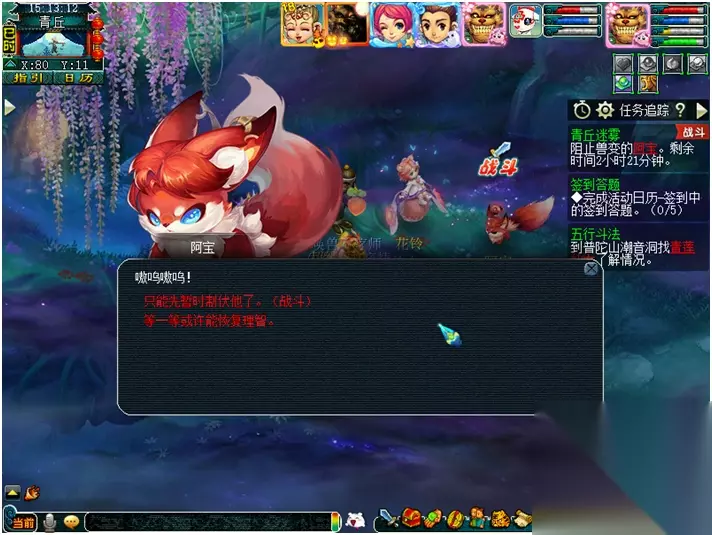 【兽变的阿宝战斗】 兽变阿宝:变身鹰击 红色的蘑菇:龙腾 紧咬的狐齿:防御 野性的蛮力:惊涛怒 战斗难度:较高 战斗回合:5回合 击杀方法:开场点杀红色的蘑菇,可让兽变阿宝恢复理智。封系可开场封印“野性的蛮力”,待阿宝逃跑后逐一击杀剩下的“野性的蛮力”。